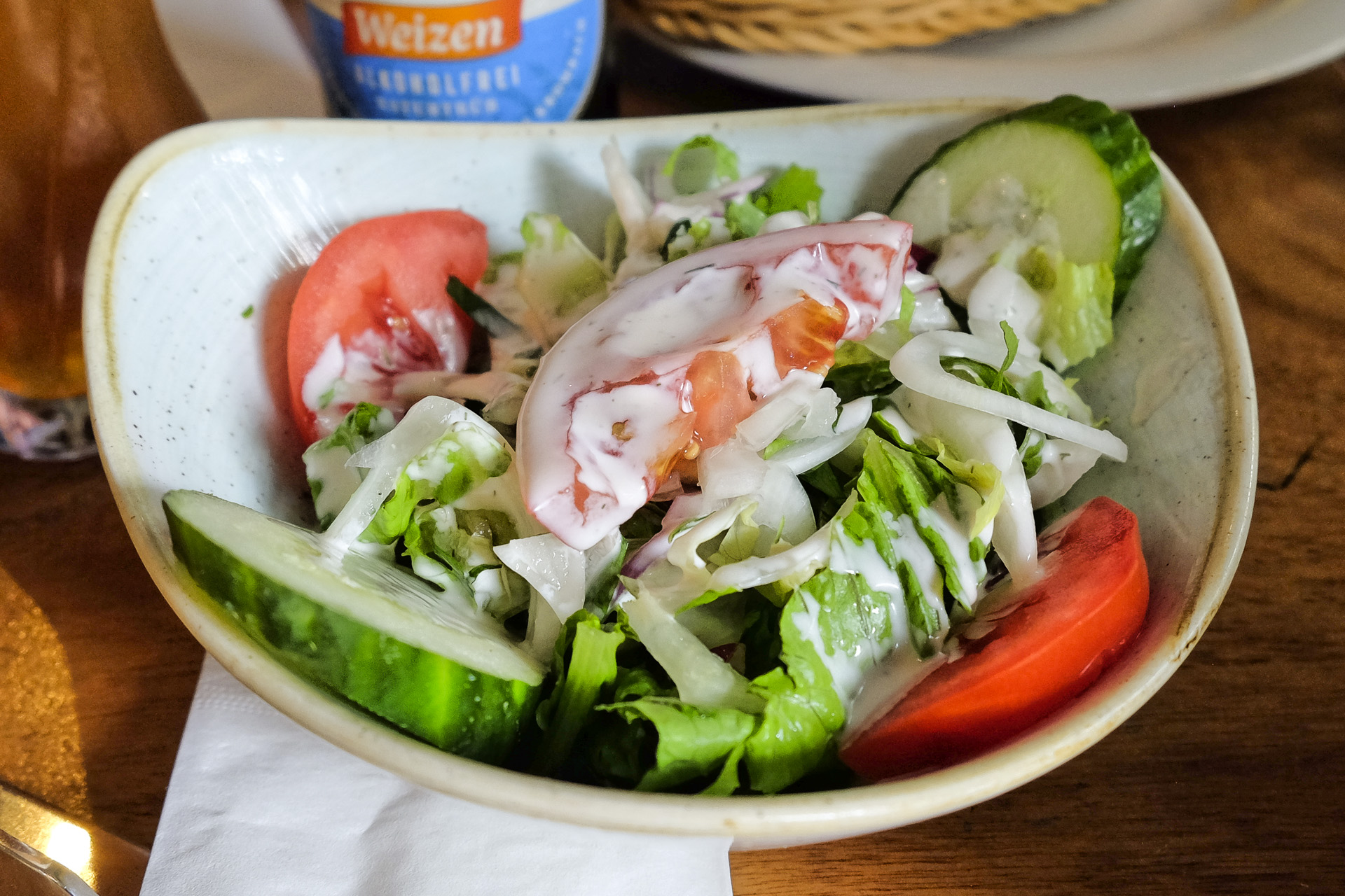 Dazu gab es einen gemischten Salat mit Salat, Tomaten, Karotten, Gurken, Zwiebeln und einem aromatischen Dressing. Sehr lecker.