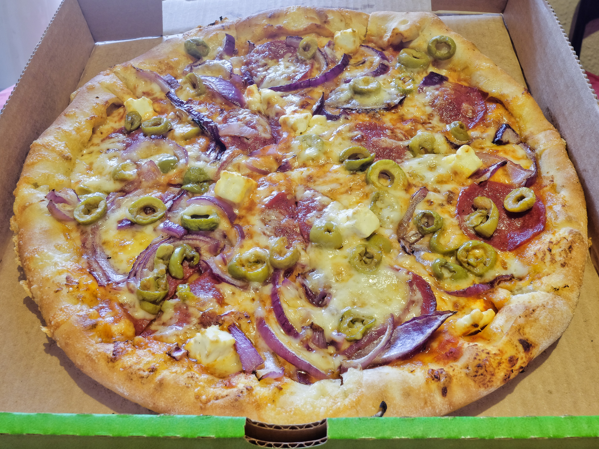 Die Pizza hatte einen dünnen Teig der am Rand etwas dicker war. Belegt war die Pizza mit Tomatensauce, Käse, Hirtenkäse, Sucuk, roten Zwiebeln und grünen Oliven. Sehr lecker, sie war schön saftig mit viel Käse, die Sucuk war geschmacklich aber wenig authentisch.