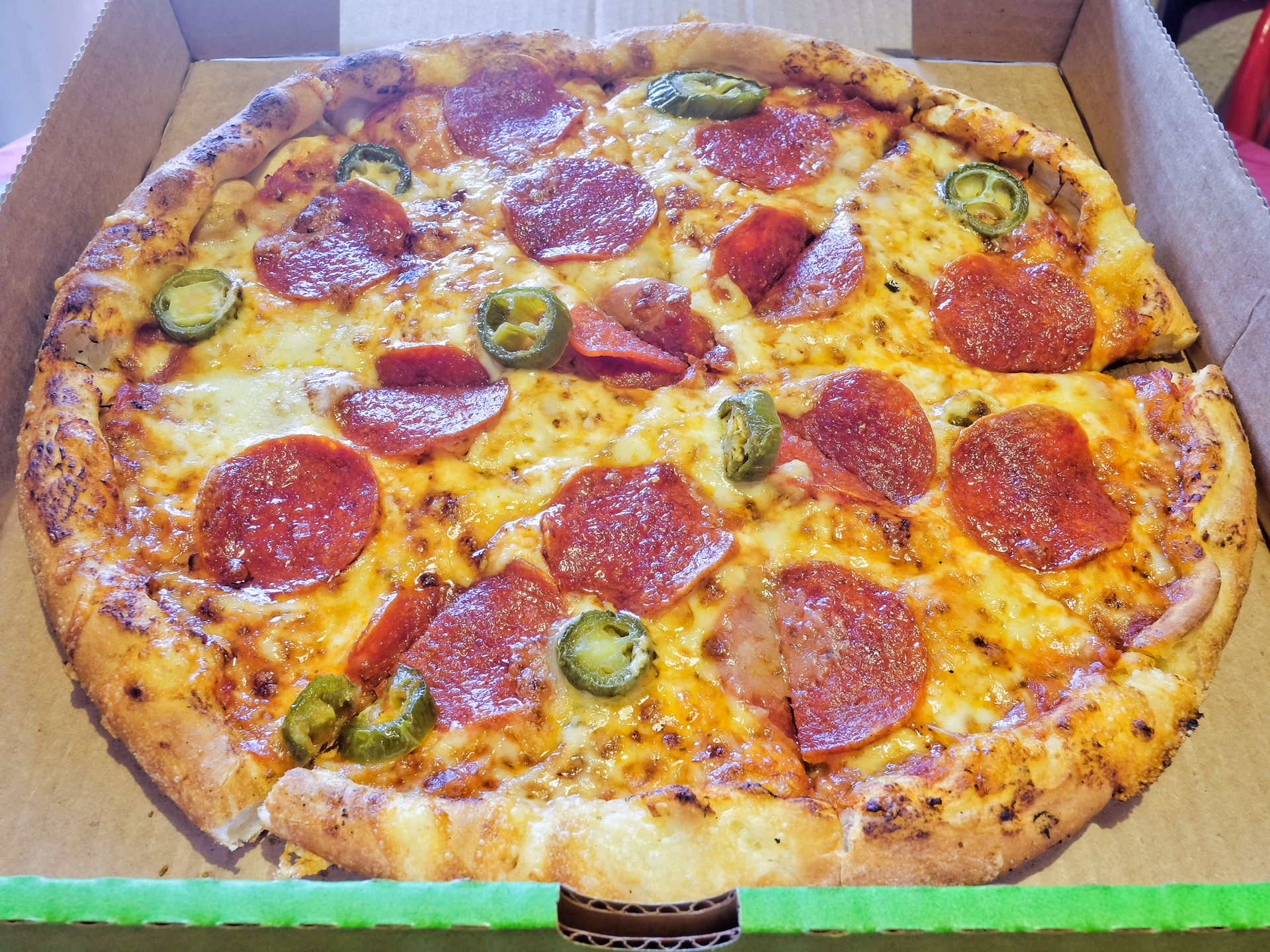 Die Pizza hatte einen dünnen Teig der am Rand etwas dicker war. Belegt war die Pizza mit Tomatensauce, Käse, Chili Salami, Mozzarella und Jalapenos. Sehr lecker, sie war schön saftig mit viel Käse, für eine "Diavolo" war sie aber nur leicht pikant.