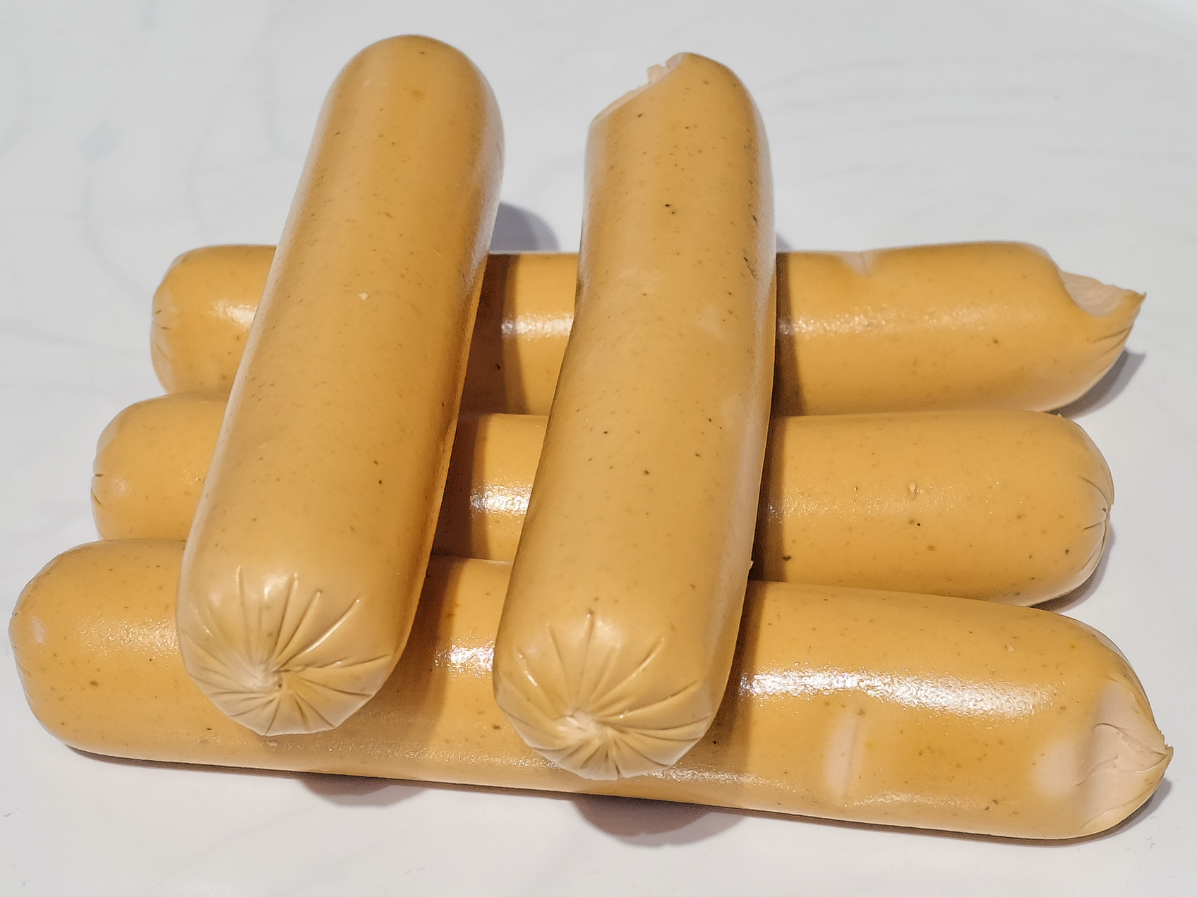 Vegetarischee Mühlen Würstchen Vegetarische Würstchen Alternative mit Eiklar, gegart, geräuchert