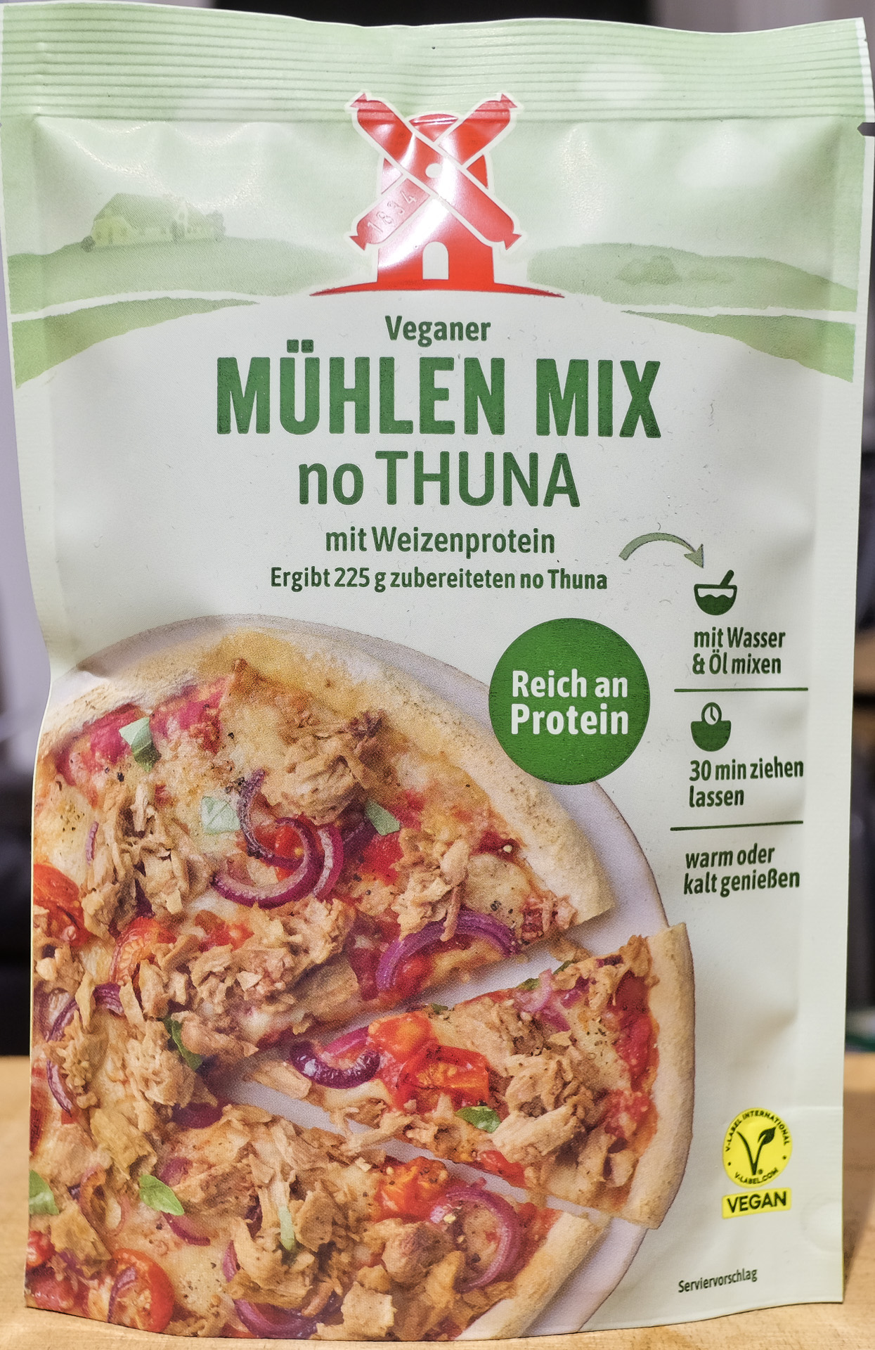 Unser Veganer Mühlen Mix no Thuna kann alles, was echter Thunfisch auch kann - außer schwimmen! Er kann Pizza Tonno, Vitello