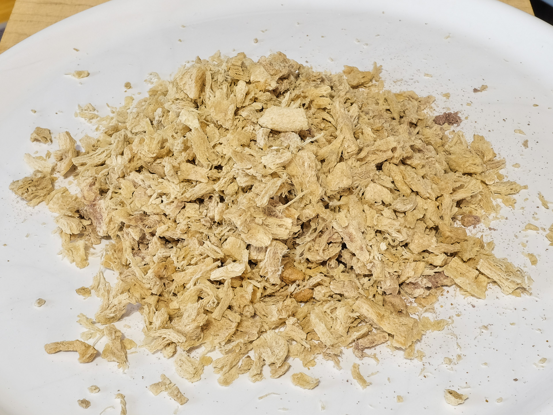Rein optisch kam es Thunfisch aus der Dose schon recht nahe. Geruch und Geschmack waren aber rein pflanzlich, da erinnerte nichts an Thunfisch. Allenfalls ganz lecker, es ist auch recht salzig.