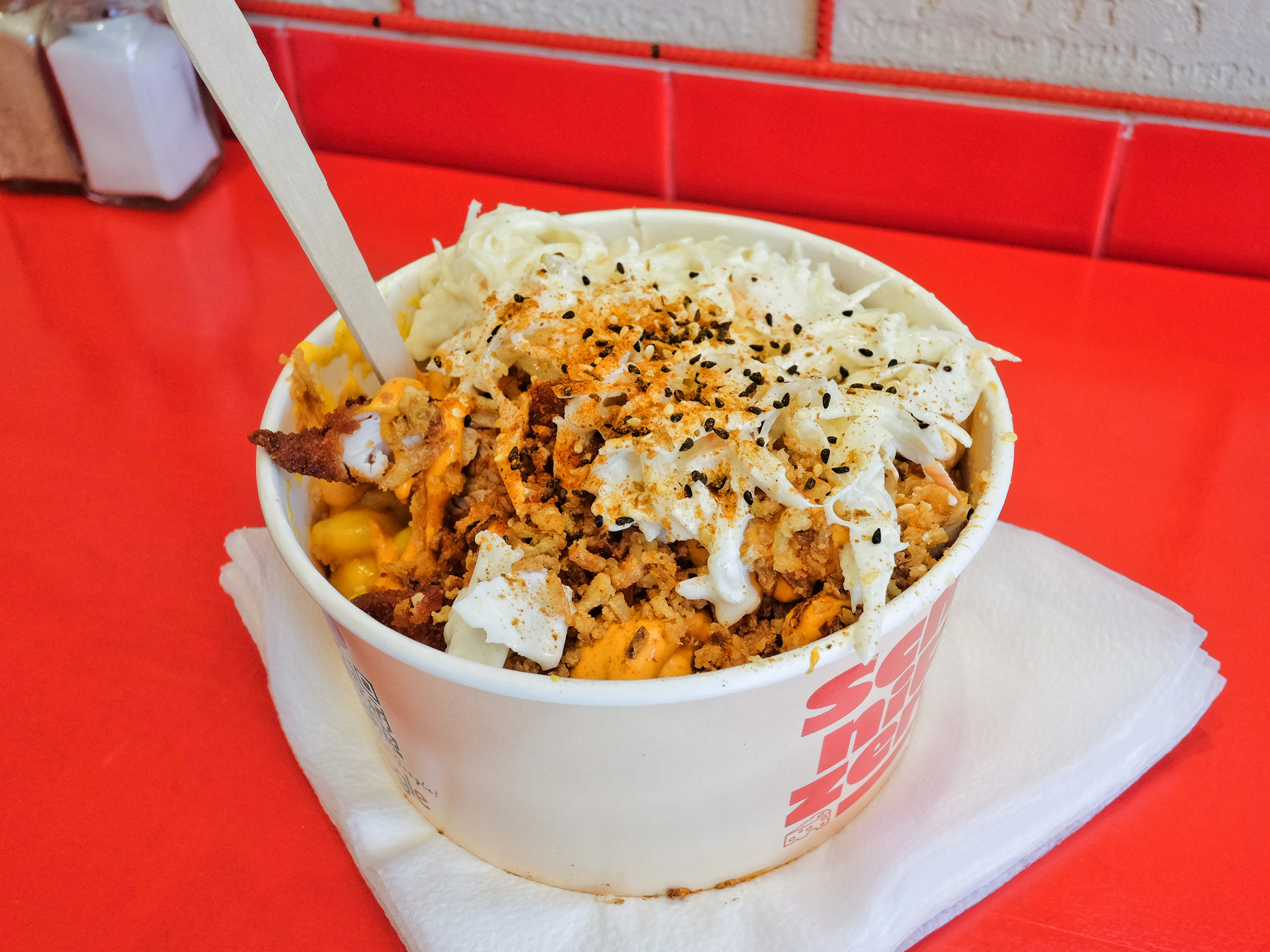 Eine interessante Kombination aus Macaroni and Cheese und Schnitzel. Die Makkaroni waren leicht al dente, die Käsesoße hatten ein feines, leicht pikantes Aroma, sie hätte aber etwas kräftiger nach Käse schmecken können. Das Schnitzel (aus Hühnerfleisch) war zart, saftig und hatte eine krosse Panade. Dazu gab es etwas Krautsalat, eine Knoblauch Sauce, Röstzwiebeln und etwas Sesam und Gewürze. Der Krautsalat hatte eine angenehme Textur und ein feines Aroma. Ein schönes Gericht mit einer deutlichen, aber angenehmen Schärfe. Sehr lecker.