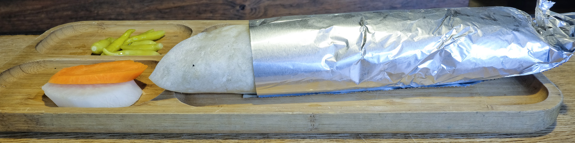 Die Köfte waren recht grob, gut gewürzt und leicht pikant, dazu gab es einen Salat aus Tomaten, Zwiebeln und Eisbergsalat. Eingerollt war es in ein Yufka Fladenbrot (Dürüm). Als Beilage gab es noch Rettich, Karotte und sauer eingelegte scharfe grüne Peperoni. Sehr lecker.