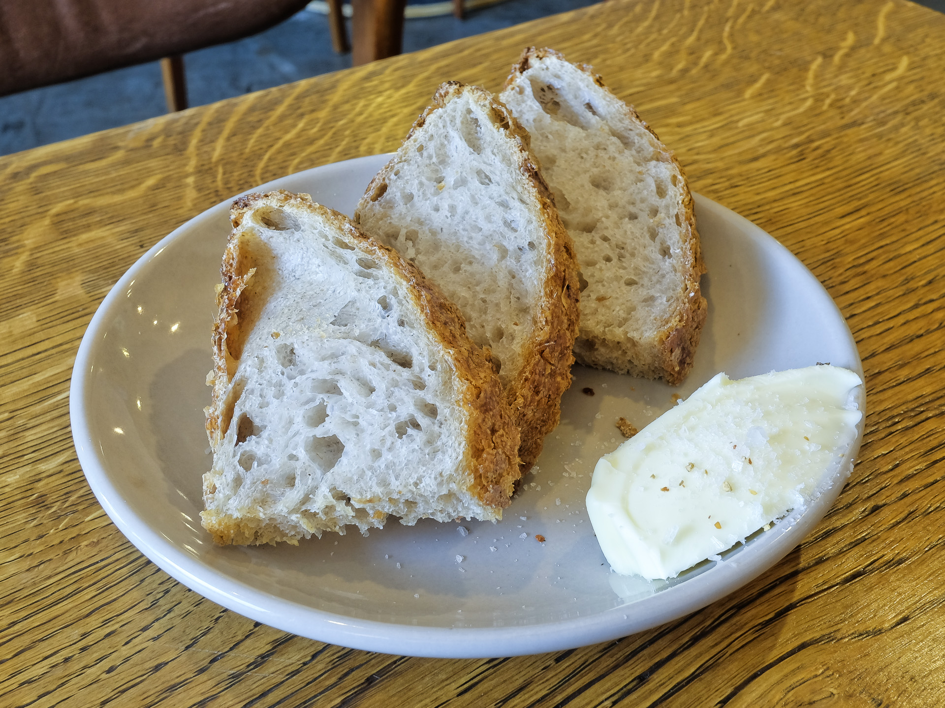 Es wurde etwas Brot und Butter gereicht. Das Brot hatte eine rösche Kruste und eine lockere Krume, sehr lecker. Die Butter war kräftig gesalzen, gerade noch sehr lecker.