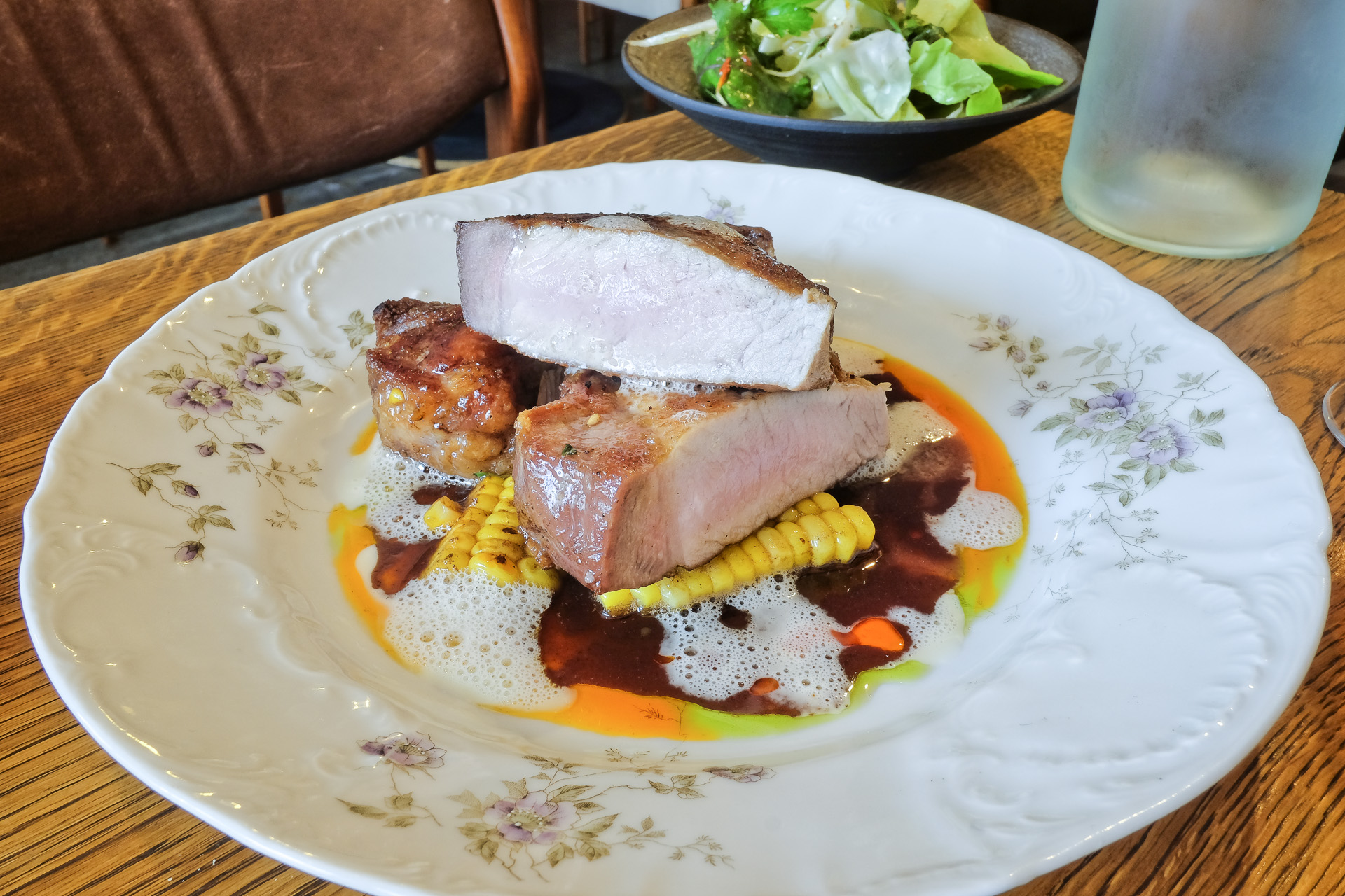 Das Schweins Kotelett war zart, mürbe und hatte ein feines Aroma. Dazu gab es zarten saftigen Mais mit feinem Aroma (Klasse) und eine aromatische Sauce. Sehr lecker.