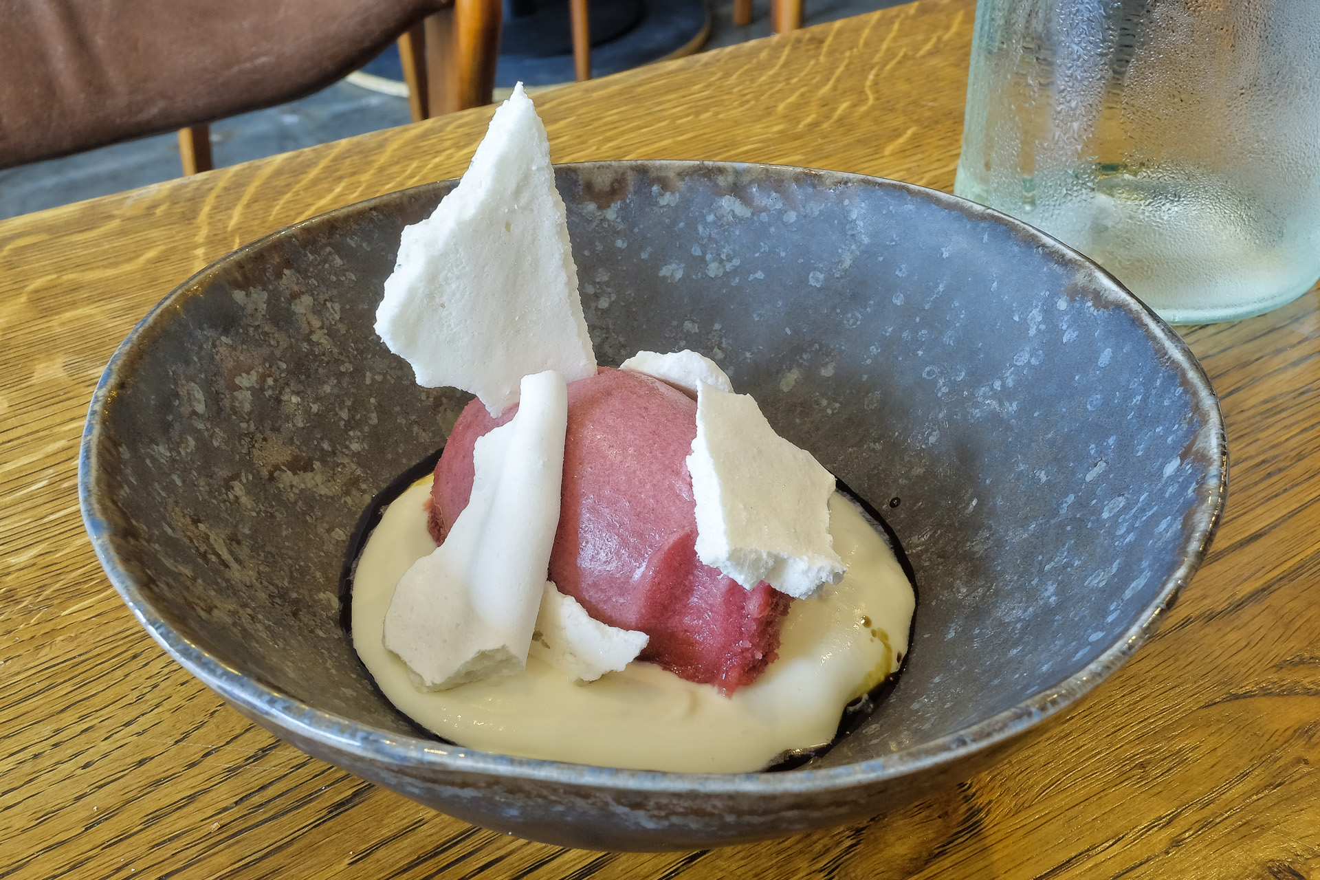 Als Dessert gab es eine zarte Ganache von weißer Schokolade mit einem Himbeer Sorbet und gefriergetrocknetem Joghurt. Etwas Puffreis sorgte für texturelle Abwechslung. Sehr lecker.