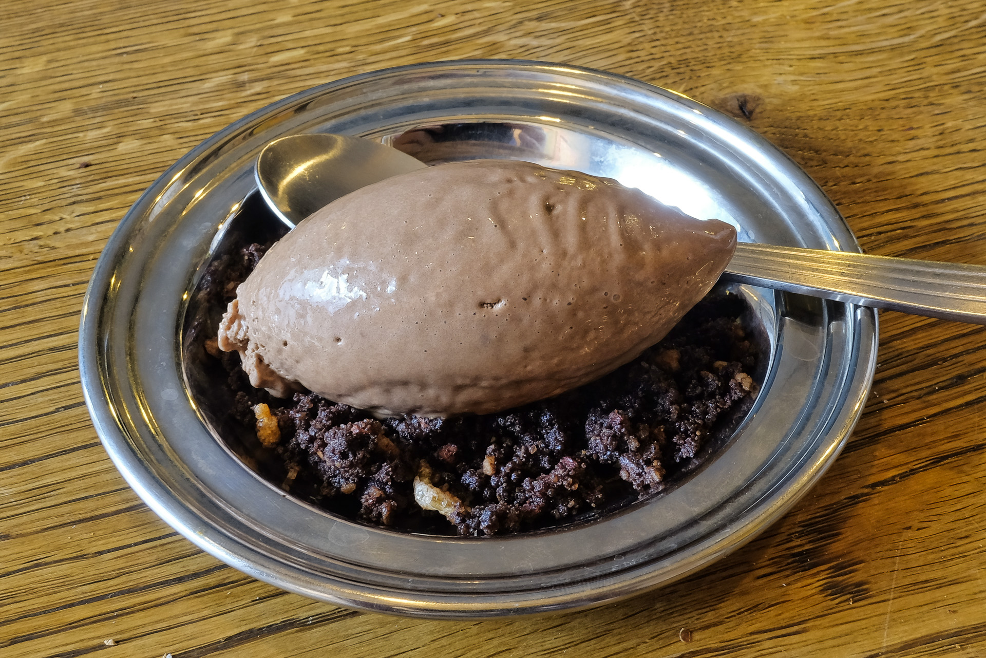 Das Mousse au Chocolat war schön cremig und nicht zu schaumig, es hatte ein feines Aroma. Dazu gab es eine Art krosse Krümel von Schokoladenkuchen und etwas Puffreis. Die Krümel hatten eine leichte Salznote die gut zum Mousse au Chocolat passte. Sehr lecker, Klasse.