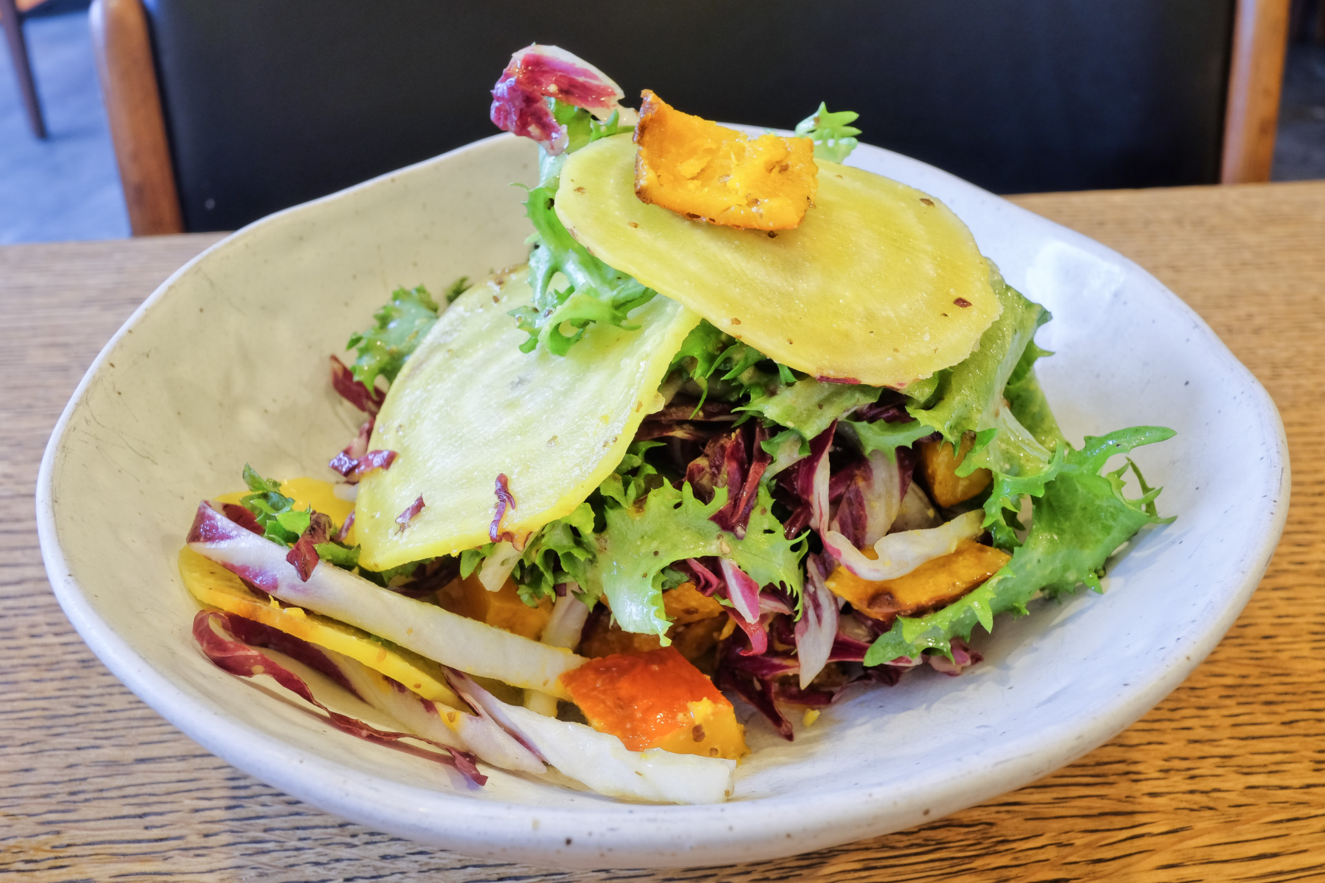 Der Salat enthielt gelbe Beete, Radicchio, Friseesalat und Kürbis. Die gelben Beete waren sehr knackig, der gegarte Kürbis hatte als Kontrast eine mehlig weiche Textur. Sehr lecker.