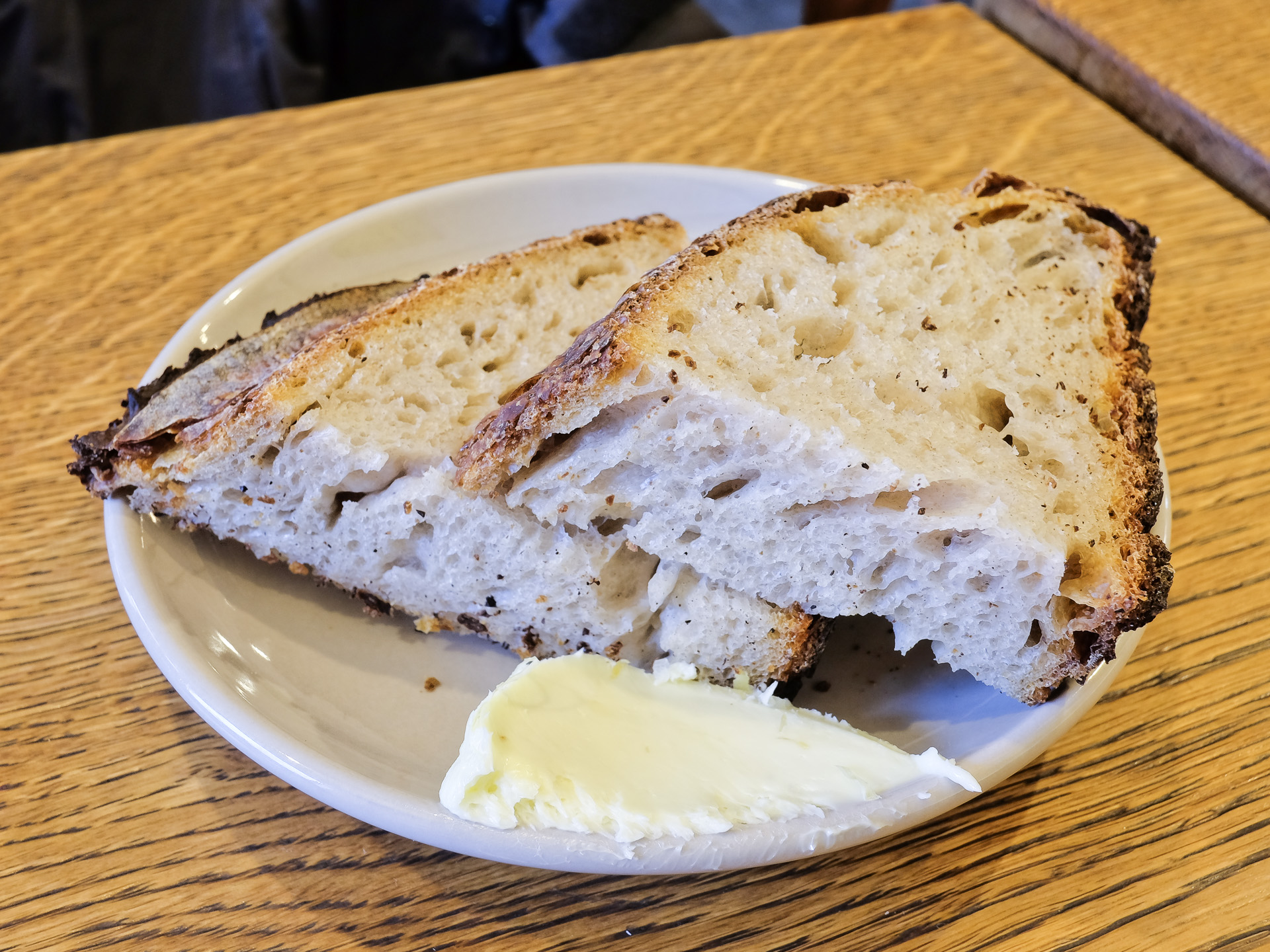 Vor dem Menü wurde etwas Brot mit schön röscher Kruste und weicher Krume gereicht, dazu gab es eine gesalzene Butter. Sehr lecker.