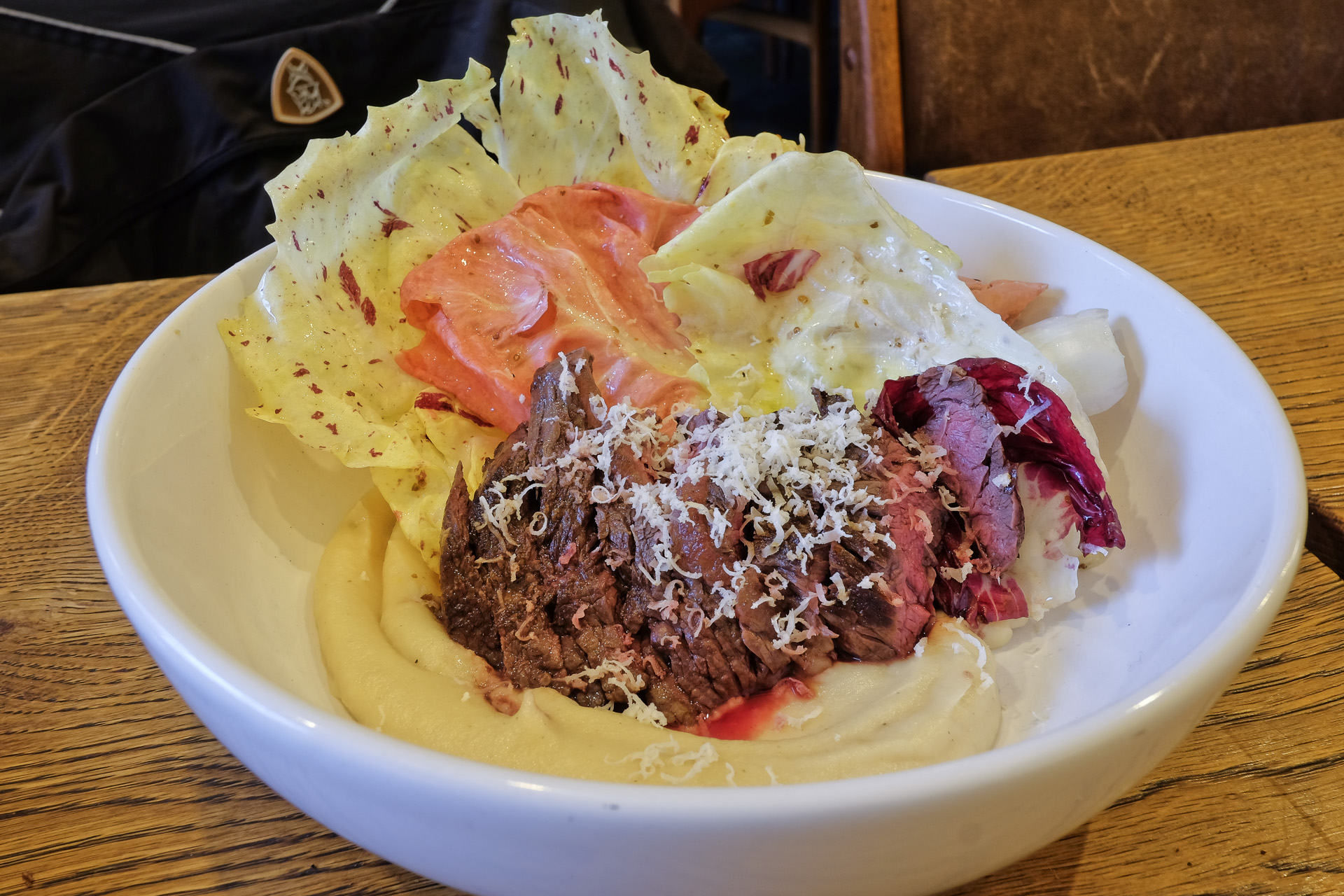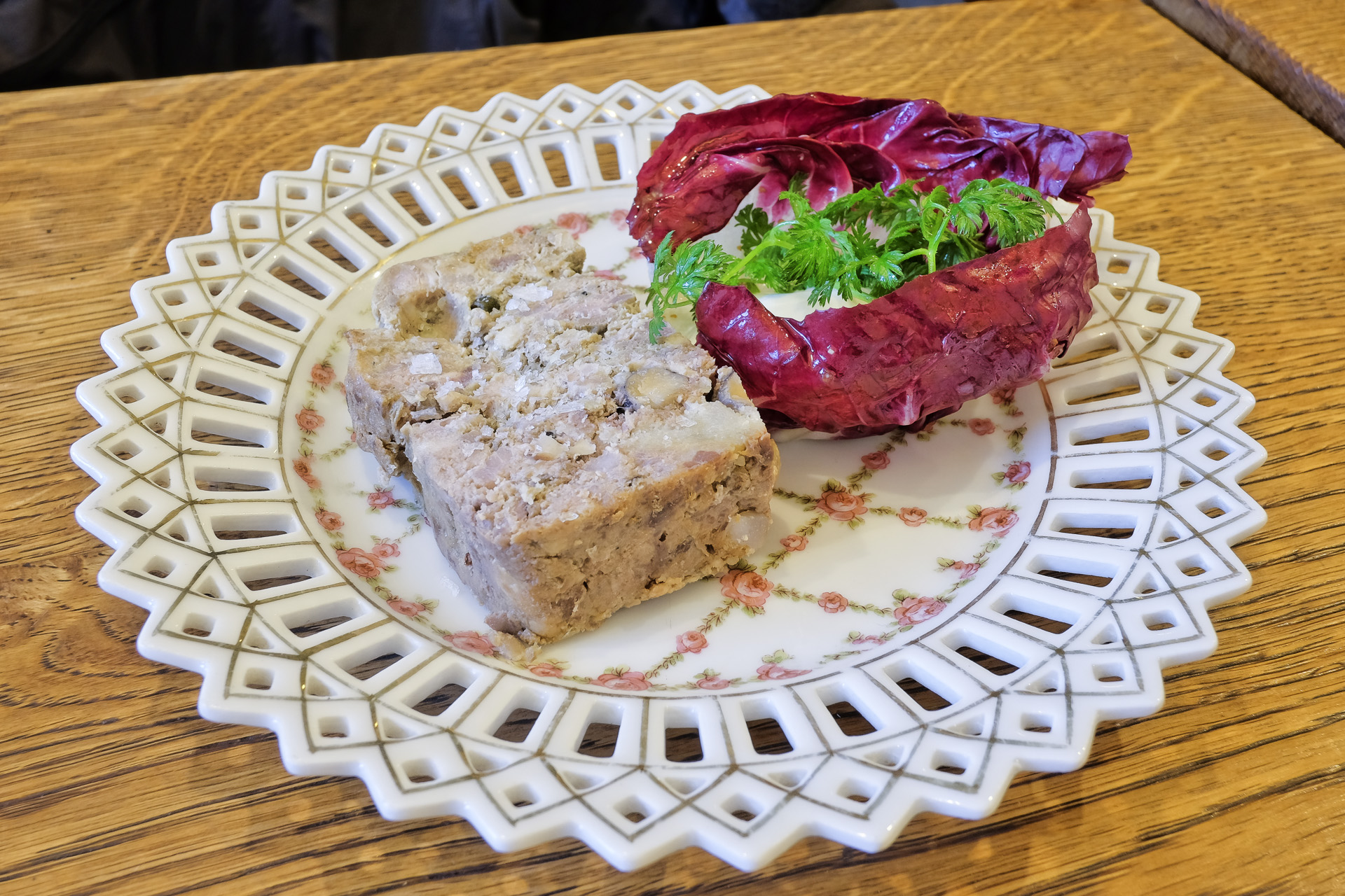 Die Pastete hatte ein feines Aroma, sie war aber etwas zu kühl. Dazu gab es etwas Radicchio und etwas Pickles. Sehr lecker.
