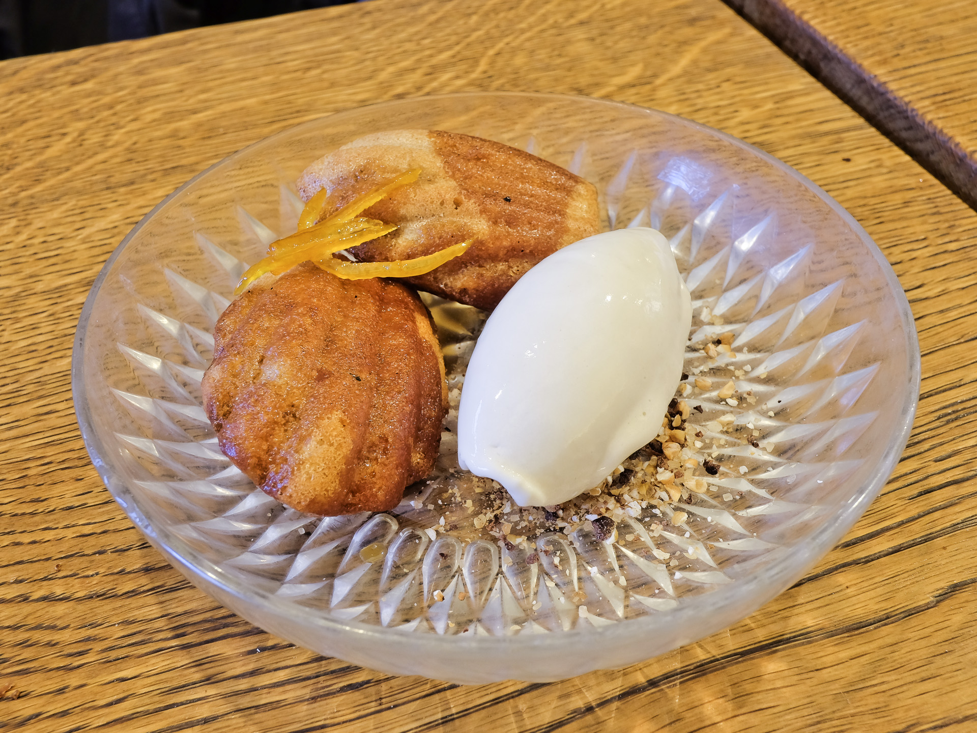 Die warmen Buchweizen Madeleines hatten eine zarte Textur und ein feines Aroma. Dazu gab es ein aromatisches, leicht salziges und sehr cremiges Topinambur Eis. Sehr lecker.