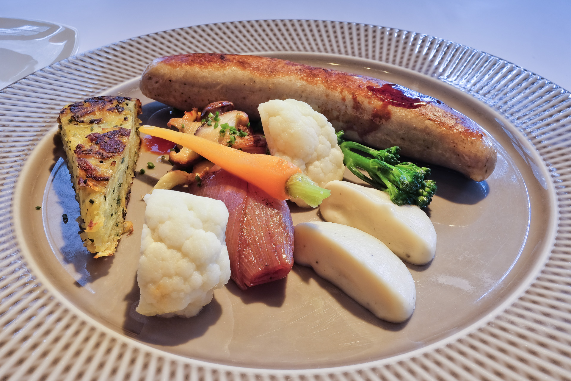 Die Bratwurst vom Duroc-Schwein war knackig und hatte eine zarte Textur und ein feines Aroma, sie war aber auch ein bischen salzig. Dazu gab es ein Stück Rösti, knackigen Blumenkohl, ein zartes Blumenkohl Püree, etwas wilden Brokkoli, eine geschmorte Schalotte, eine kleine Karotte, etwas aromatische Pilze und eine aromatische Sauce. Sehr lecker.