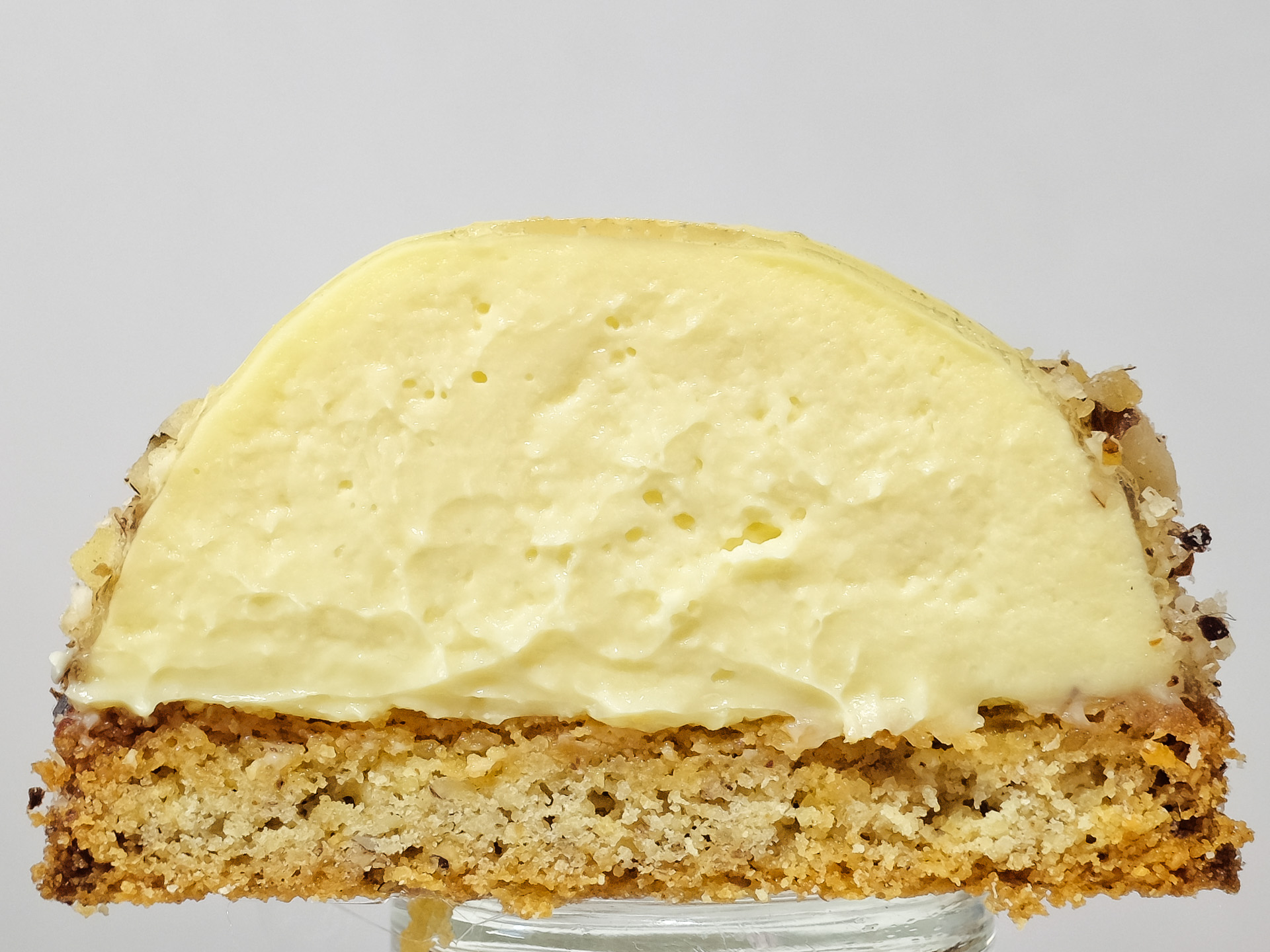 Die Creme hatte eine zarte Textur und ein feines Yuzu Aroma, bedeckt war sie mit einer dünnen Schicht Tortenguss. Der bretonische Nuss Mürbeteig hatte eine angenehme Textur und eine feines Aroma. Sehr lecker.