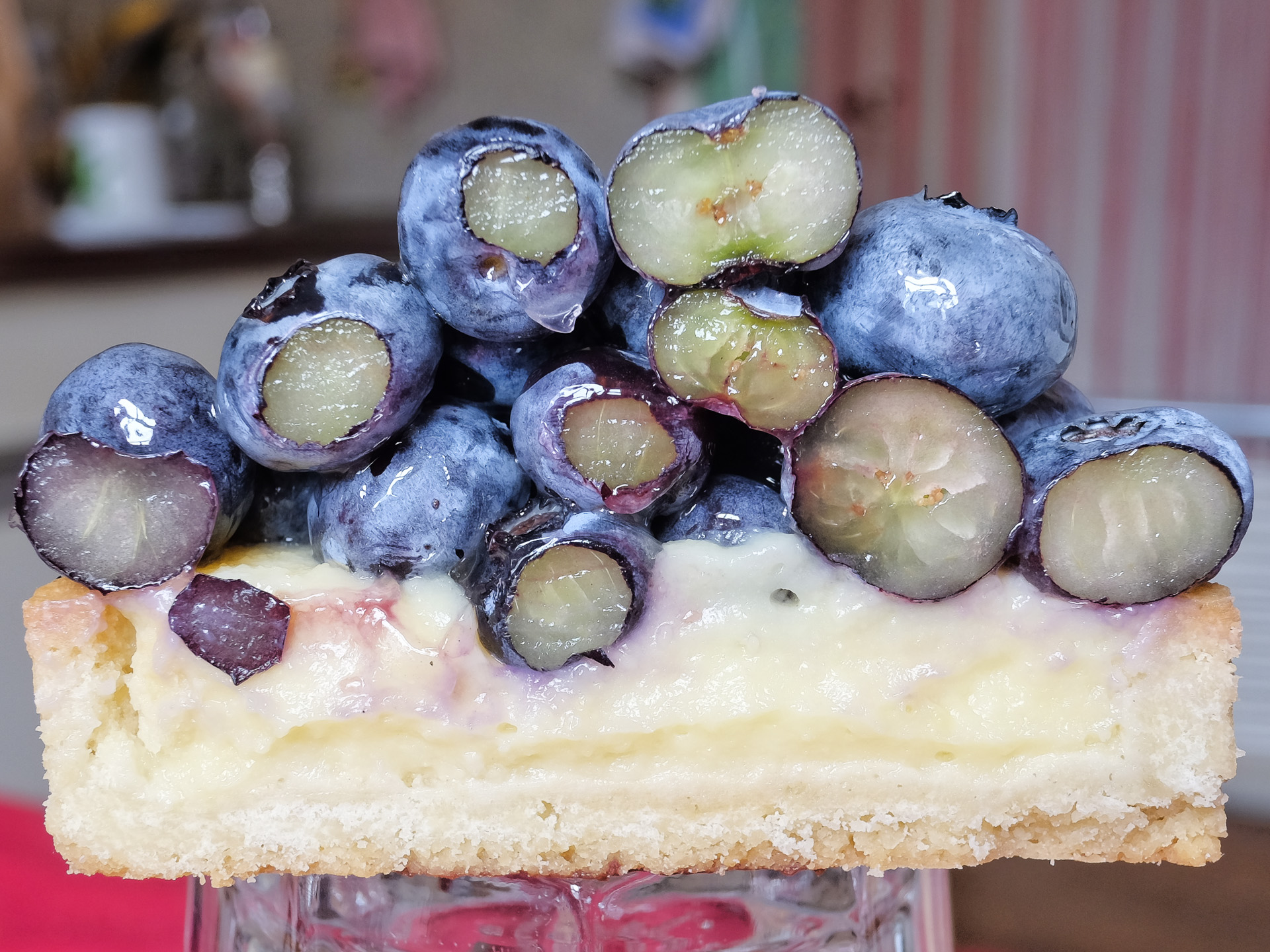 Die Tarte aus Mürbeteig war mit einem Vanille Pudding gefüllt. Die Blaubeeren waren schön aromatisch. Sehr lecker.