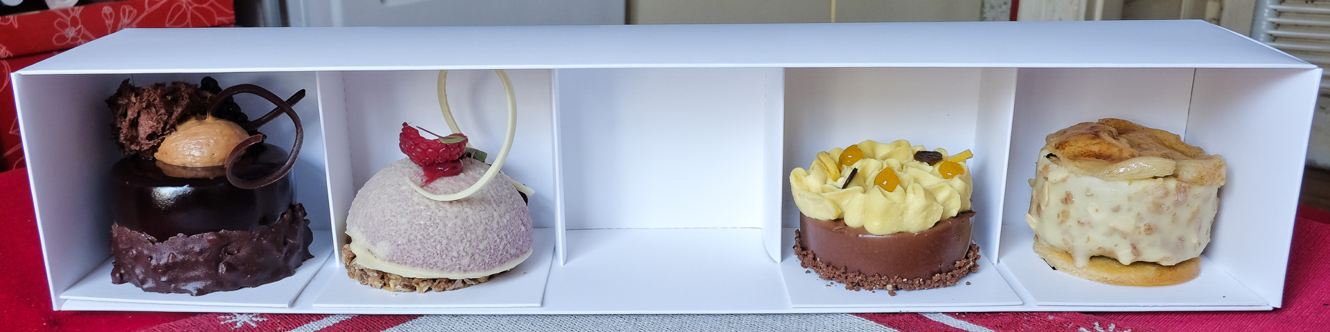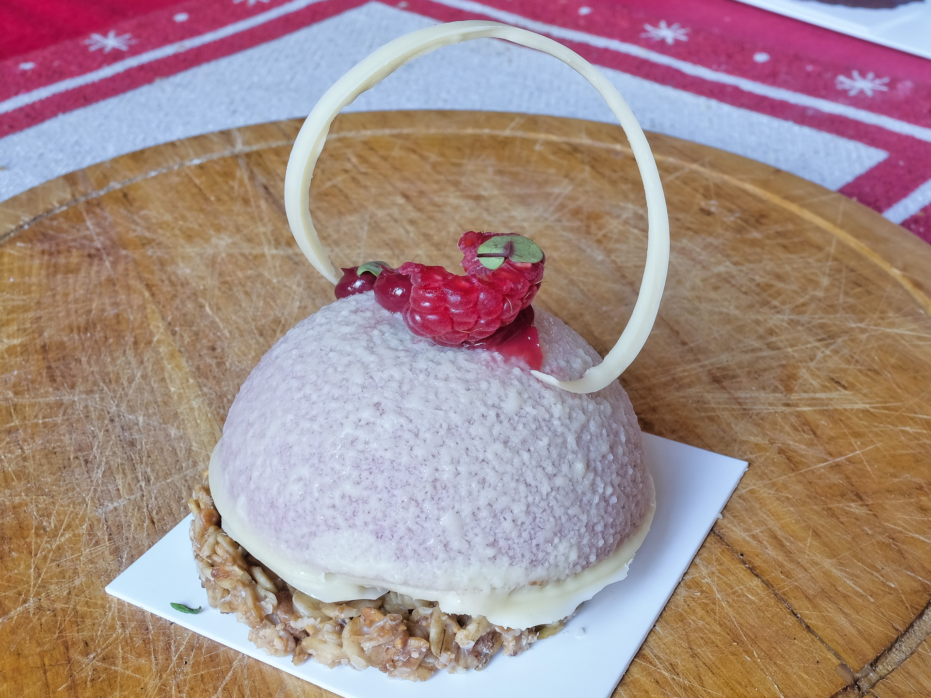 Auf einem Butter Keks war ein aromatischer Apfelmus mit Bratapfel Aroma angerichtet, den Rand bildete eine dünne Schicht weißer Schokolade. Bedeckt war das Törtchen mit dünnen Apfelscheiben als Art Kompott mit Zimt. Sie hatten eine sehr feine Textur und ein feines Aroma. Sehr lecker.