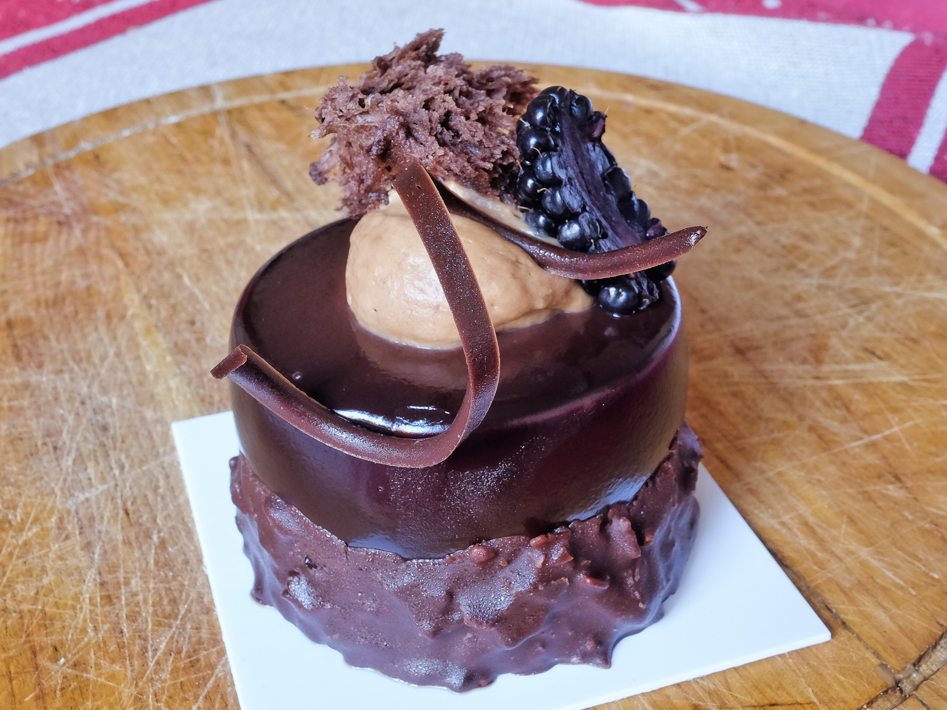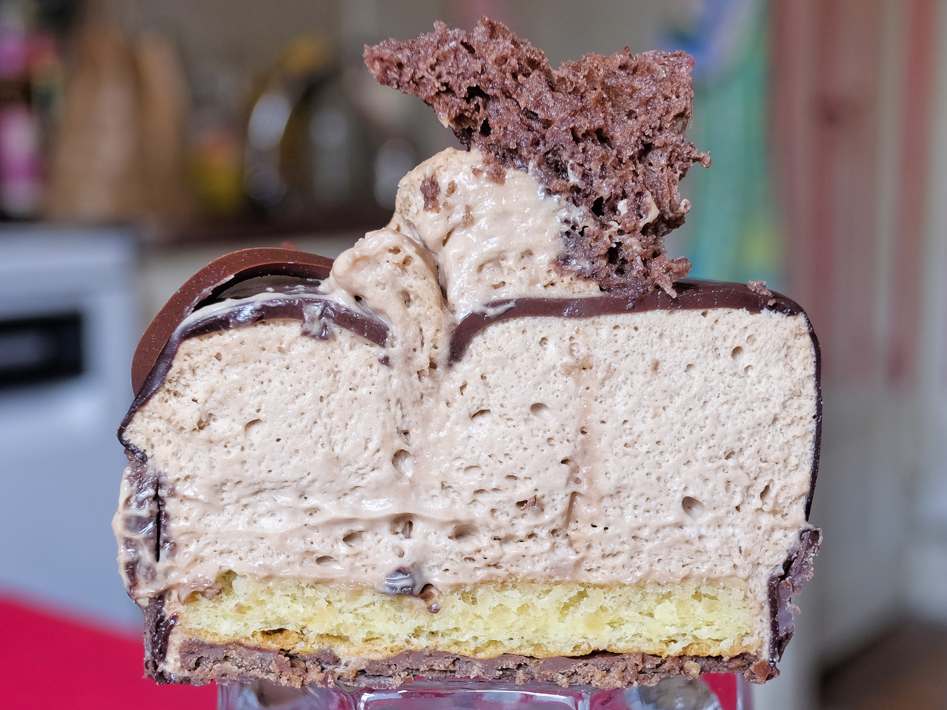 Den Boden bildete ein dünne Schicht Schokoladen Gebäck, darüber eine dünne Schicht Biskuit. Die Schokoladen Sahne hatte ein feines Aroma und eine feine Textur. Umhüllt war das Törtchen mit einer dünnen Schicht Schokoladen Glasur und etwas Schokoladen Biskuit. Sehr lecker.