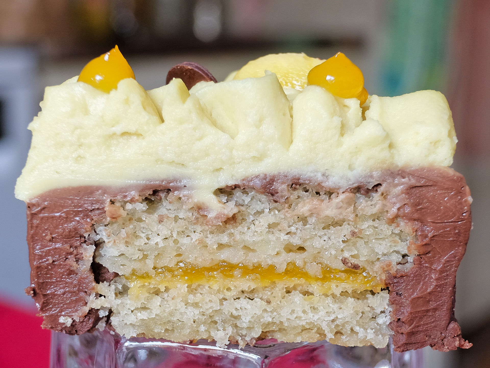 Den Kern des Törtchens bildeten zwei Scheiben Rührteig mit einer Schicht Maracuja Marmelade. Die äußere Schicht bildete eine weiche aromatische Schokoladen Creme. Bedeckt war das Törtchen mit einer fruchtigen Maracuja Creme. Sehr lecker.