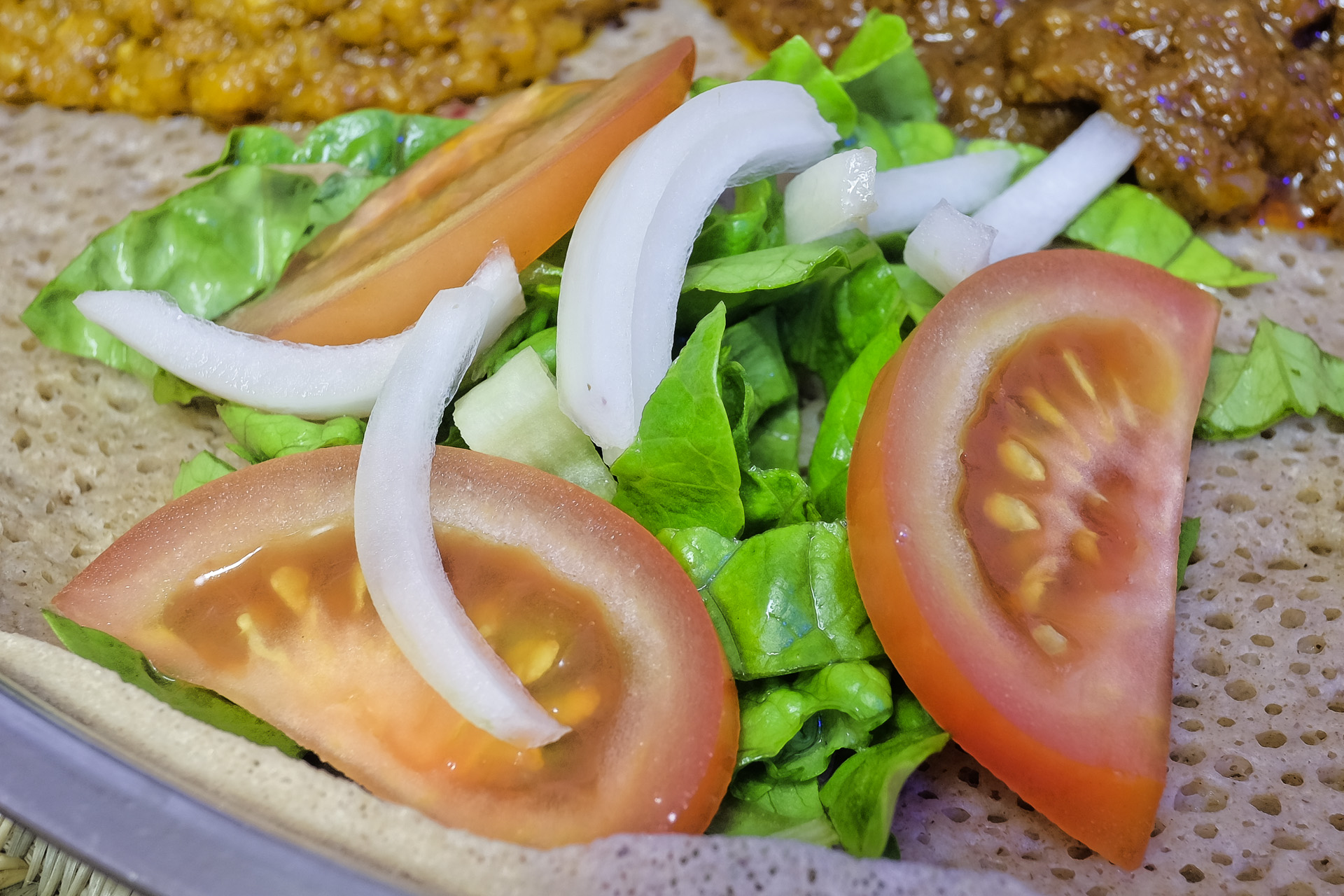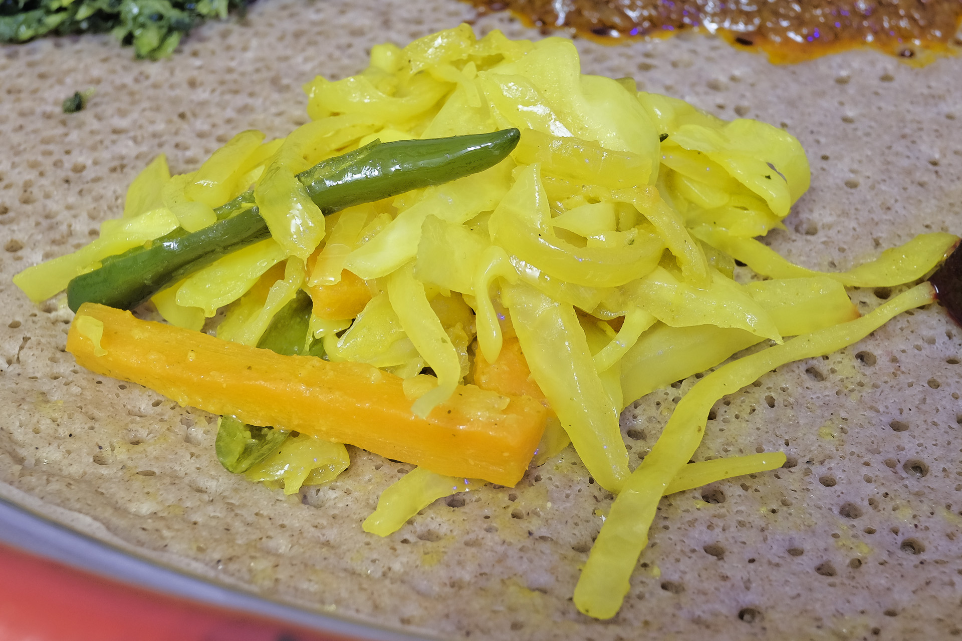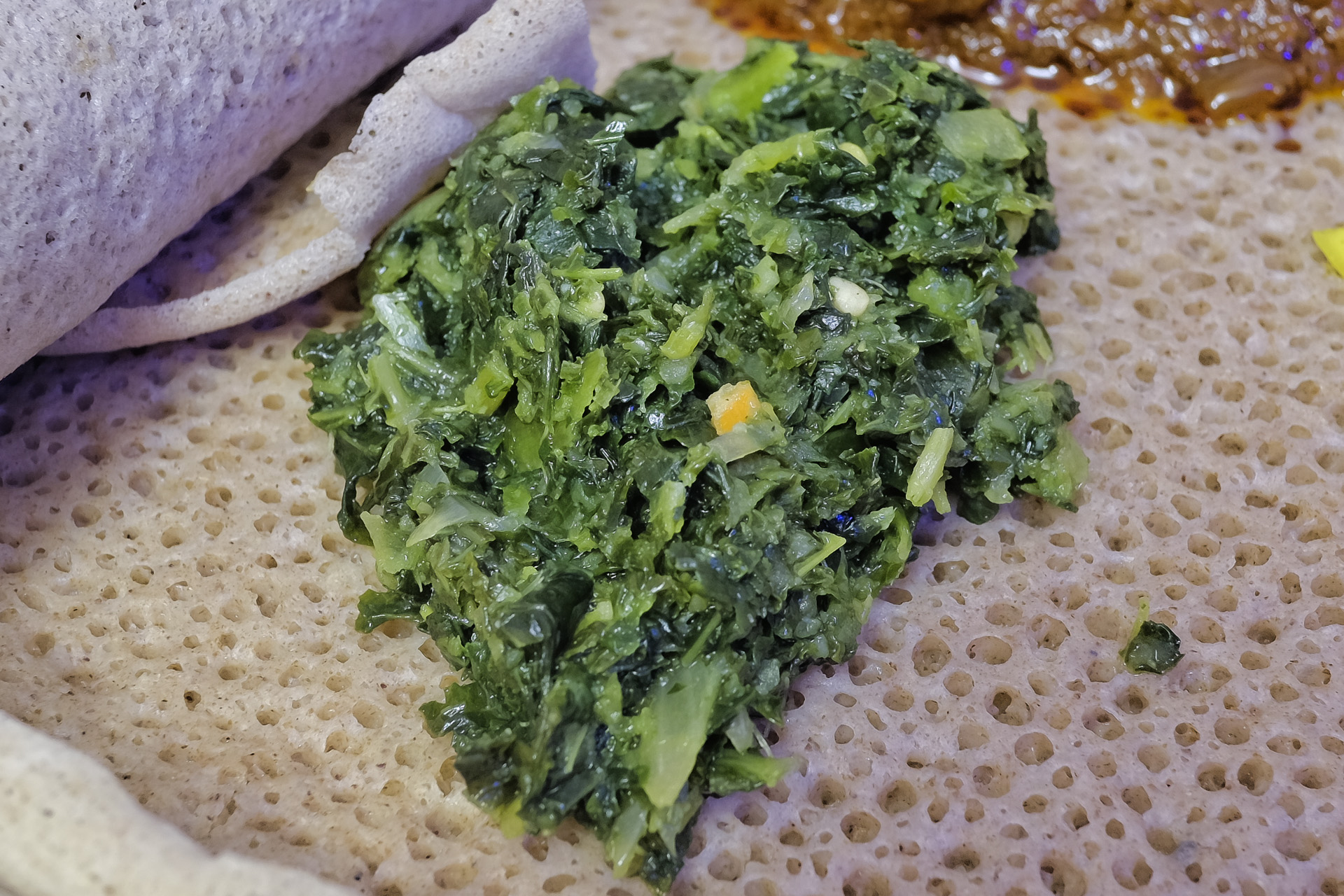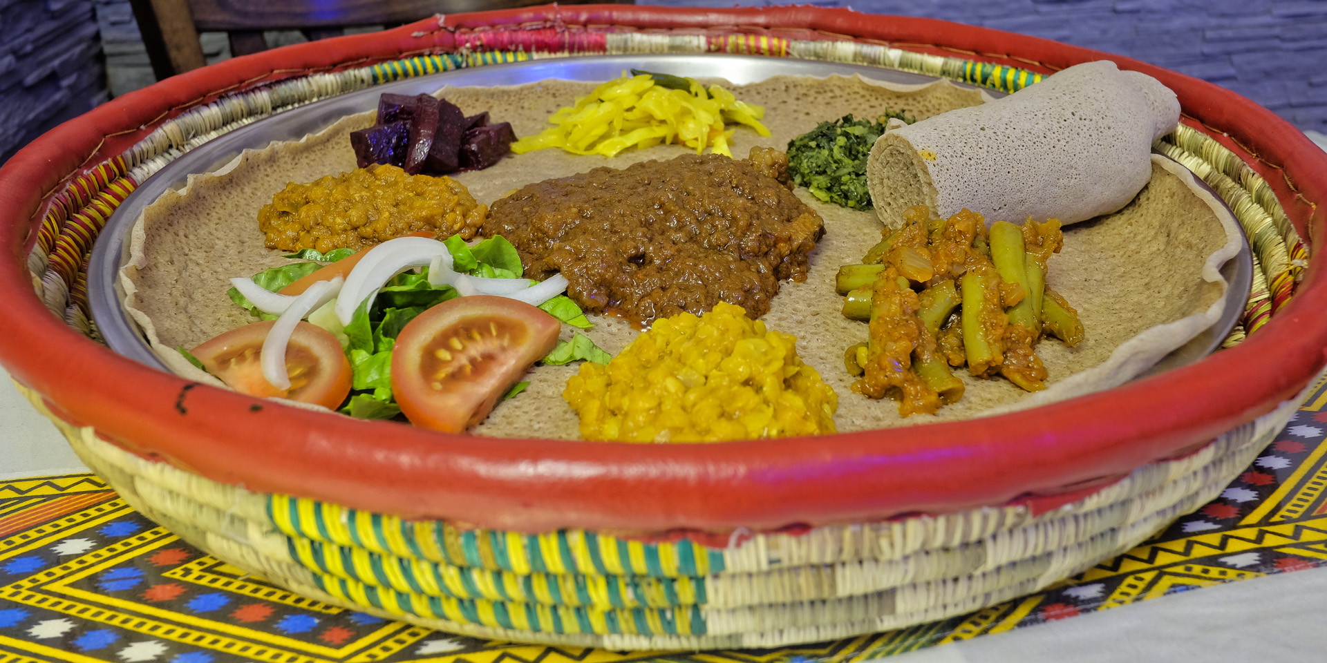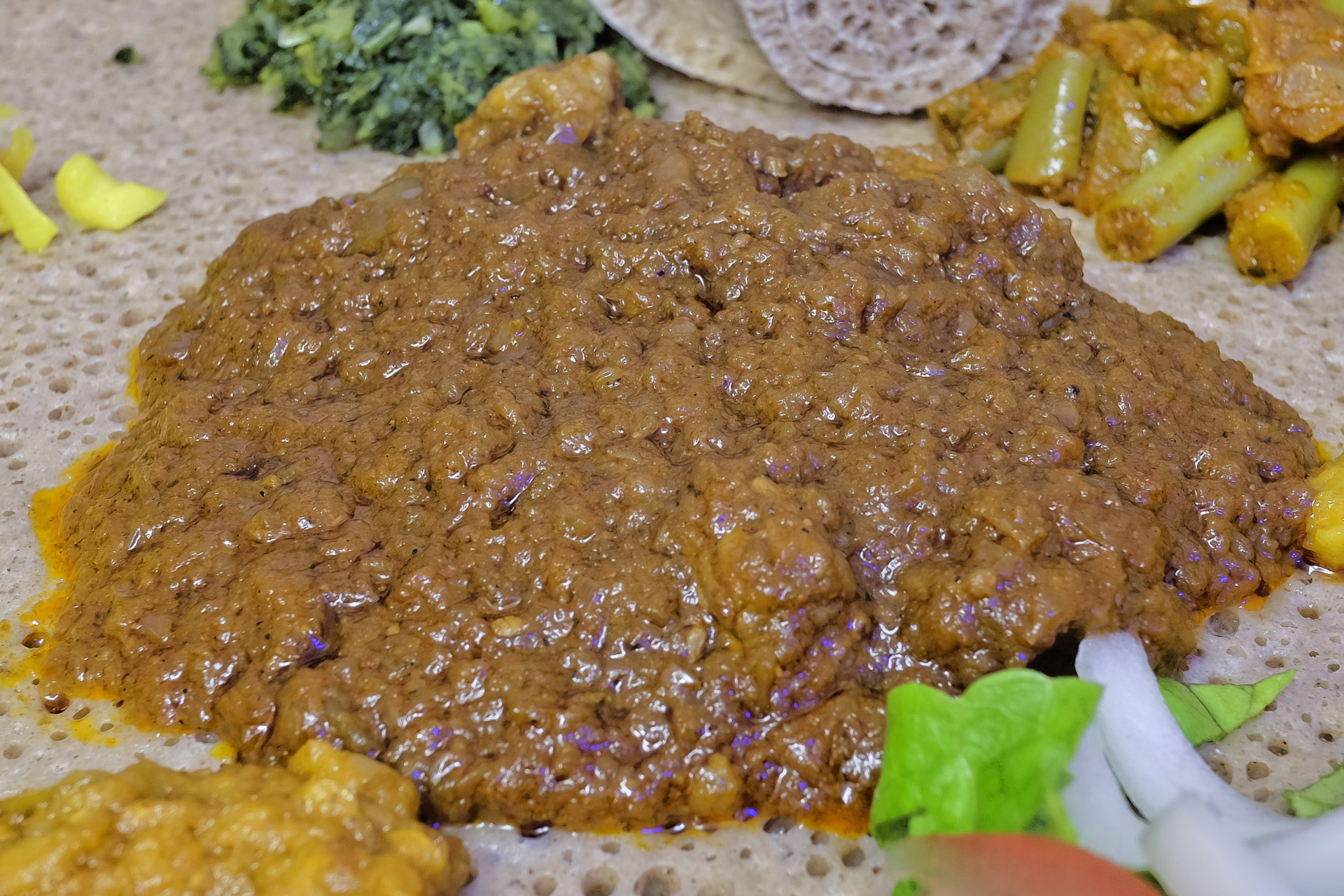 Variation des Bebiaynetu mit Zigni und bunter Auswahl veganer Spezialitäten: Grünkohl,