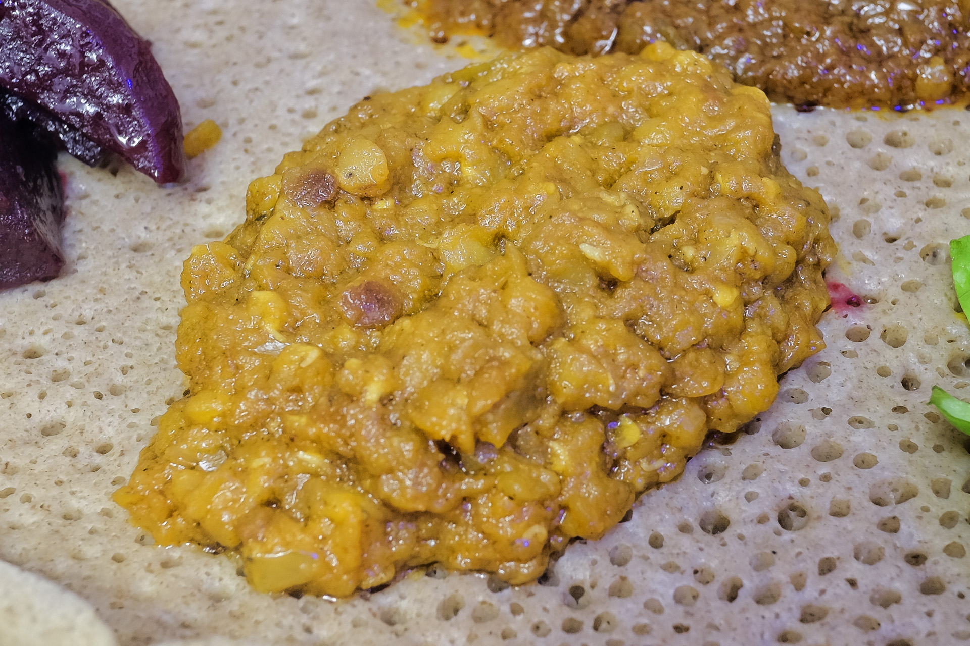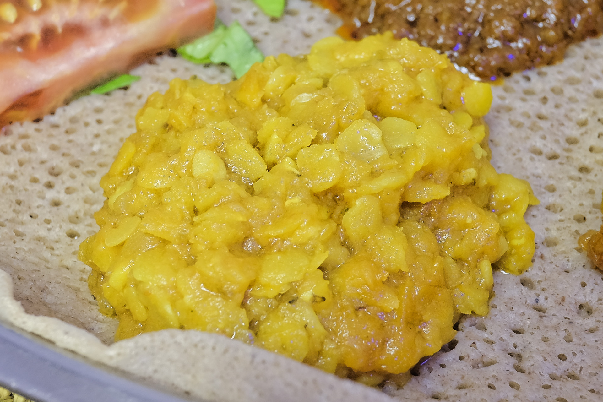 Das Beyaynetu wurde auf einem Injera Fladenbrot serviert. Das Gericht wird landestypisch mit den Fingern gegessen, auf Wunsch bekommt man aber auch ein Besteck.