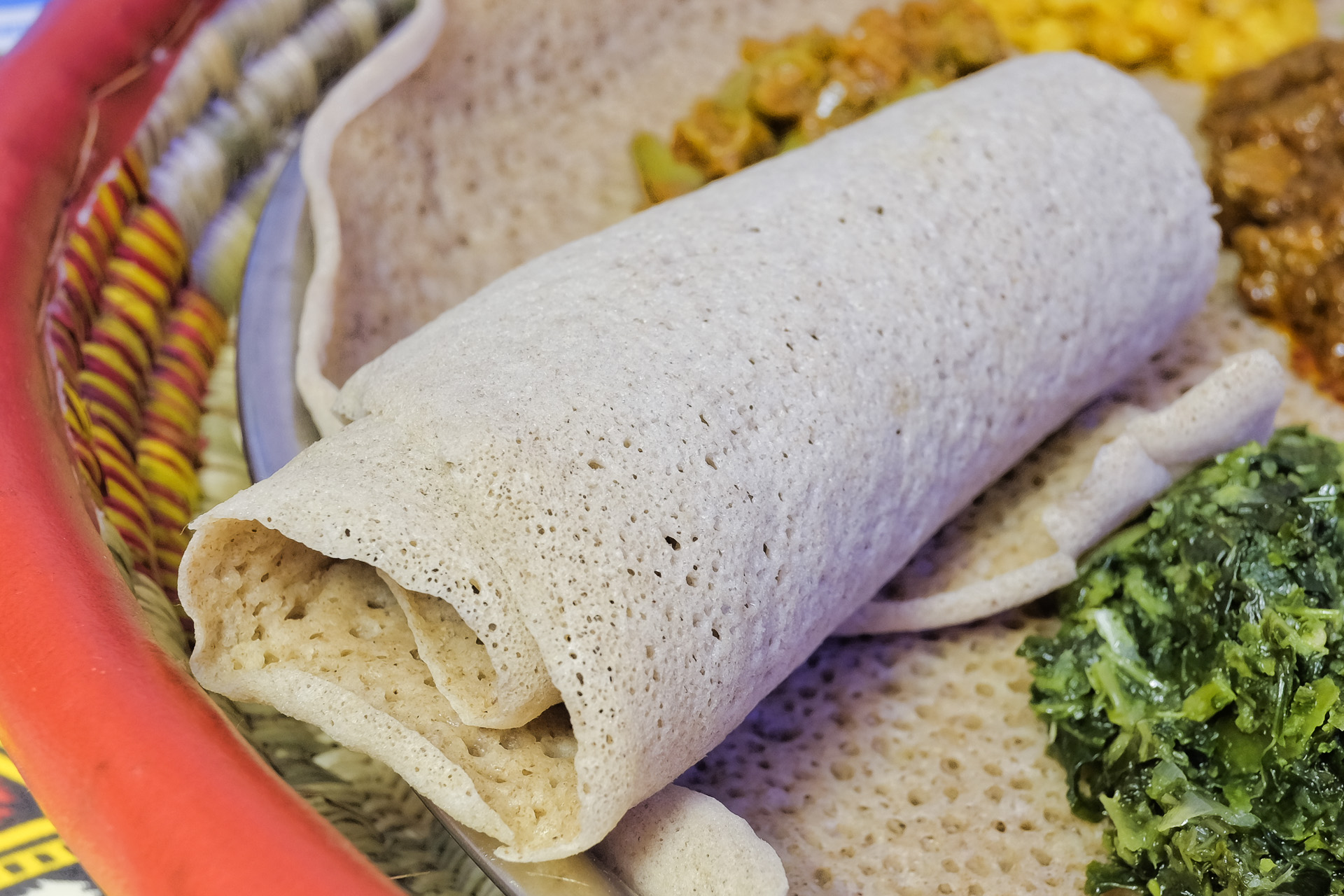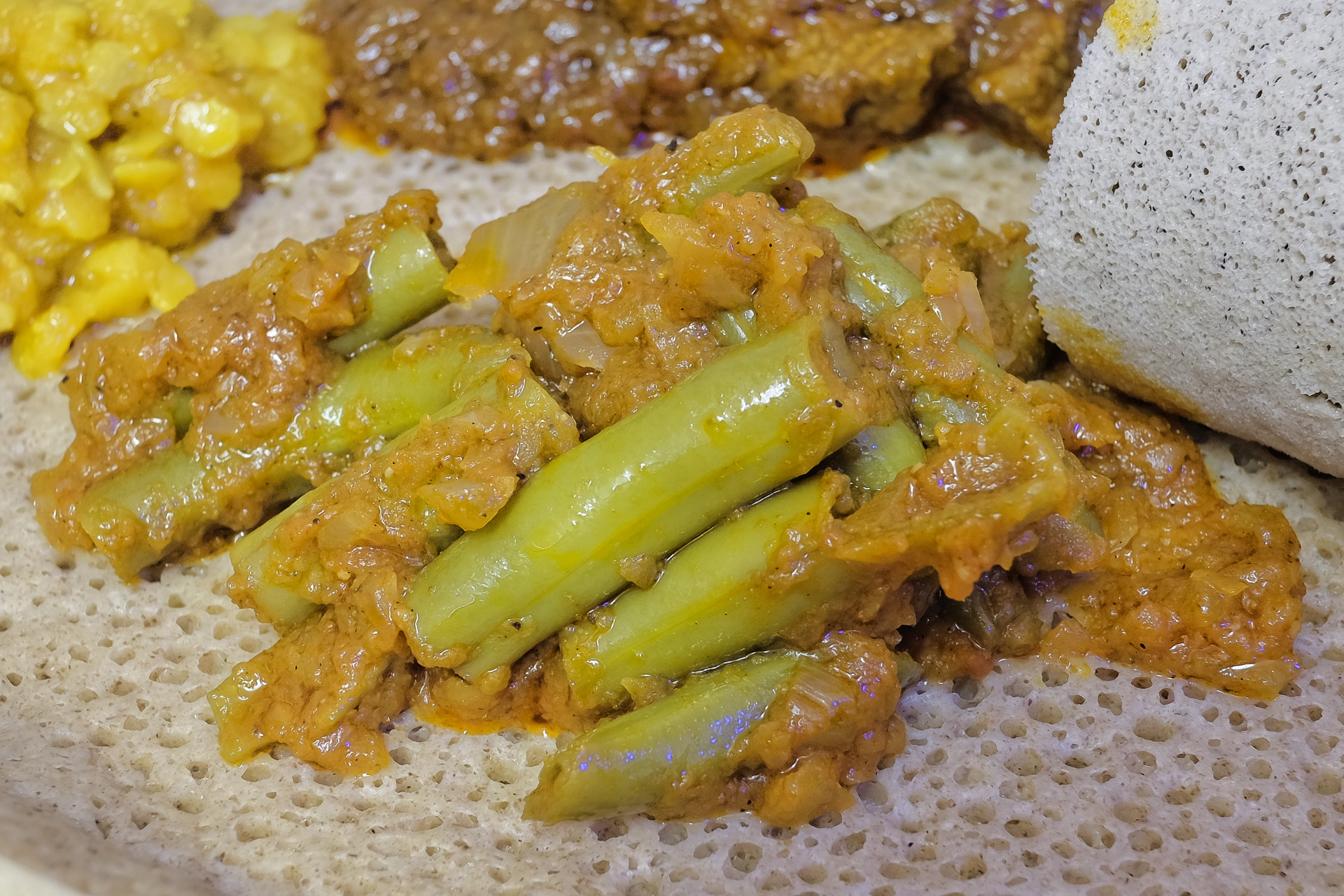 Das Injera Fladenbrot war sehr weich und schwammartig und hatte ein fein säuerliches Aroma. Hergestellt wird es aus gesäuertem Teff. Sehr lecker, es dient auch als Besteck. Sehr lecker.