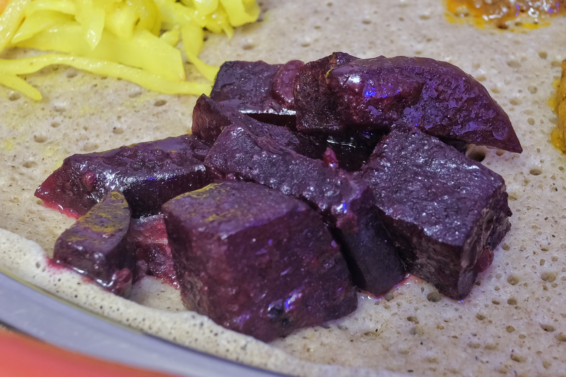 Zigni ist ein Nationalgericht der Äthiopische Küche. Das Fleisch war zart und leicht pikant (Berbere ?) gewürzt. Sehr lecker.