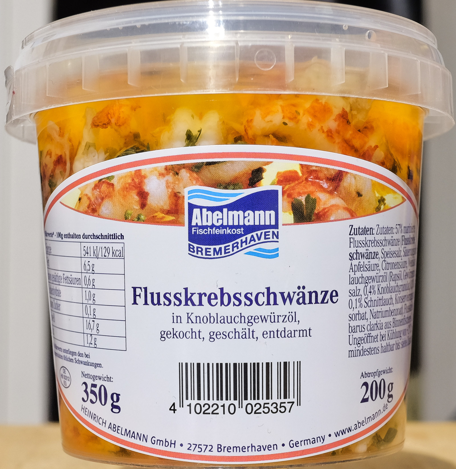 | Zutaten | 57 % marinierte Flusskrebsschwänze (Flusskrebsschwänze, Speisesalz, Säuerungsmittel: Apfelsäure, Citronensäure, Weinsäure (L+)), Knoblauch Gewürzöl (Rapsöl, Gewürz Extrakte, Speisesalz, 0,4% Knoblauchgranulat, 0,3% Petersilie, 0,1% Schnittlauch, Konservierungsmittel: Kaliumsorbat, Natriumbenzoat) Flusskrebse (Procambarus clarkii, aus Binnenfischerei in China) |