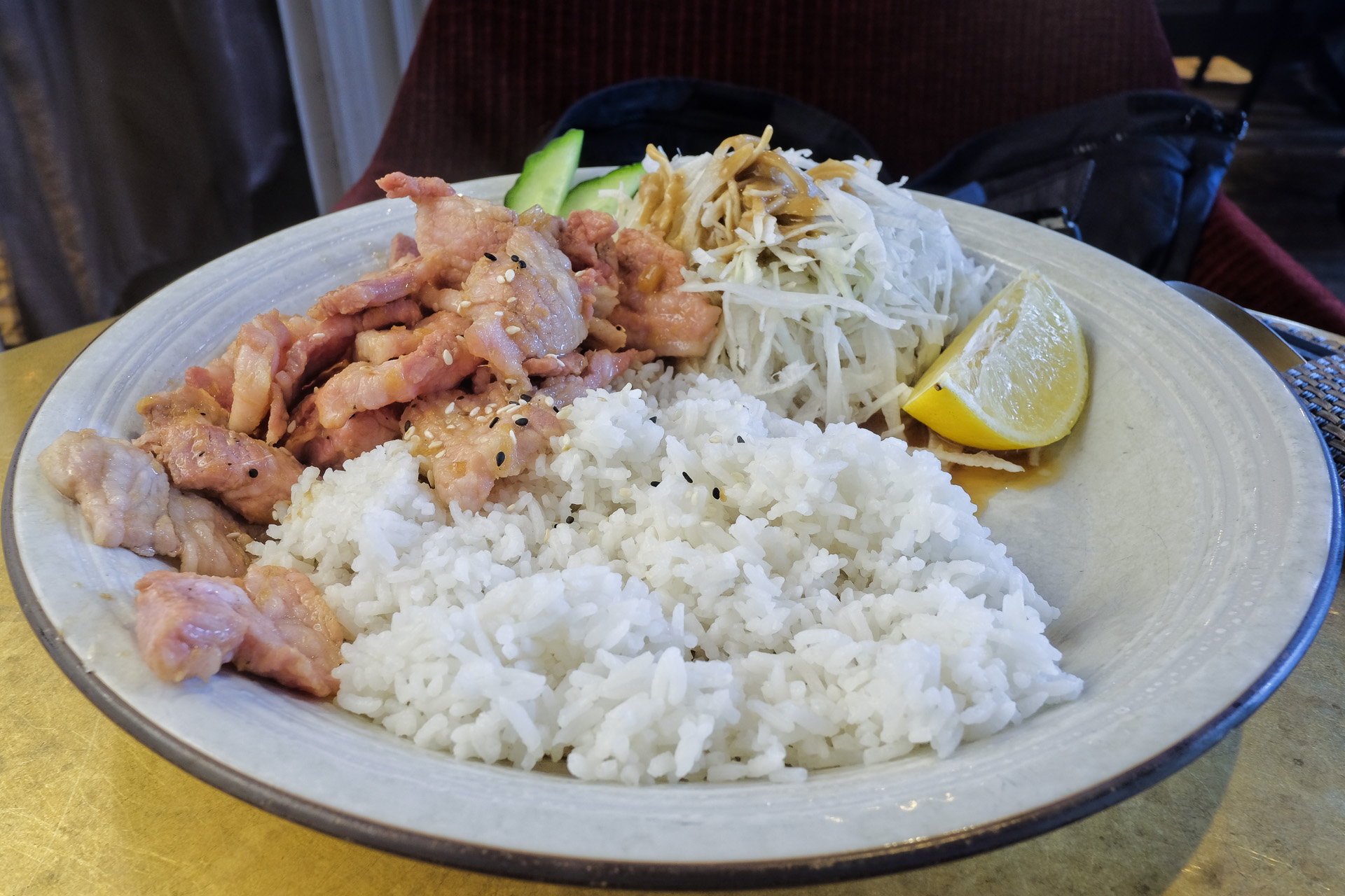 Der mit Ingwer marinierte gebratene Schweinebauch hätte ruhig etwas zarter und aromatischer sein können, da ziehe ich geschmorten Schweinebauch vor. Dazu gab es Reis und Weißkohl. Der Weißkohl hatte eine schöne knackig zarte Textur. Gerade noch sehr lecker.