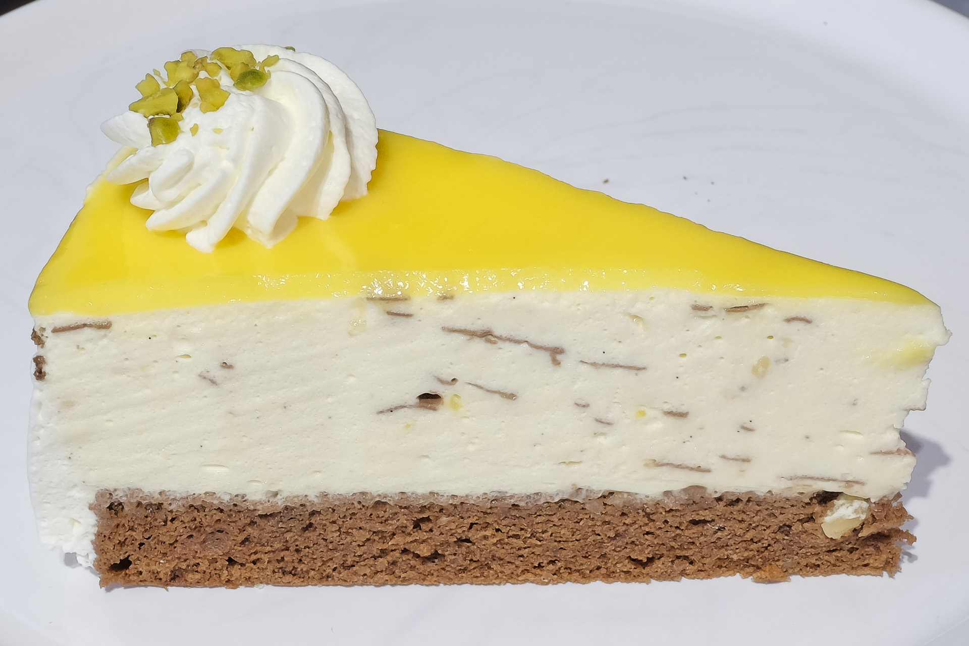 Auf einem Boden aus Schokoladen Biskuit war eine zarte Eierlikör Sahnecreme mit kleinen Walnuss und Schokoladenstückchen angerichtet. Bedeckt war die Torte mit etwas Eierlikör. Sehr lecker.