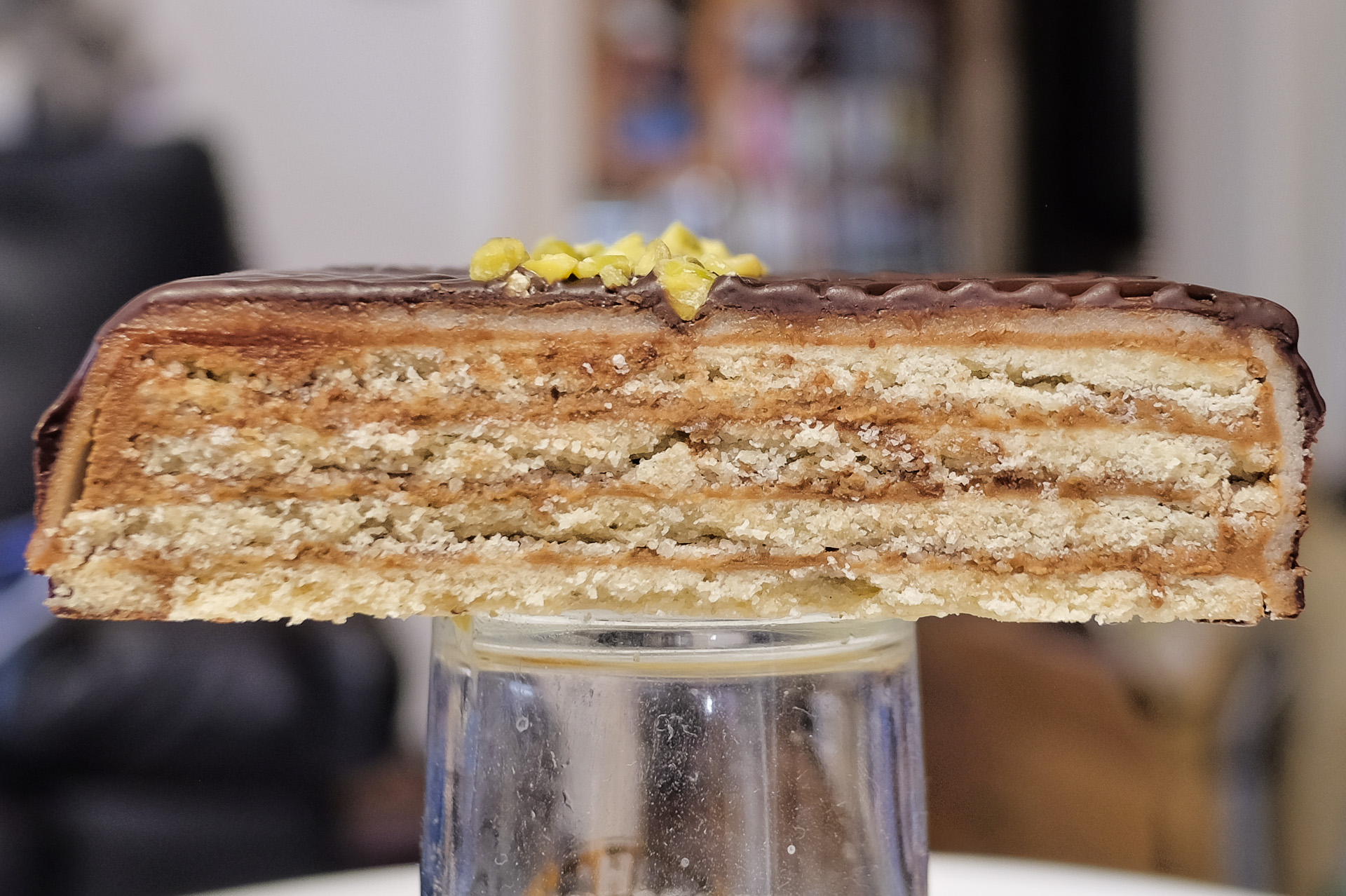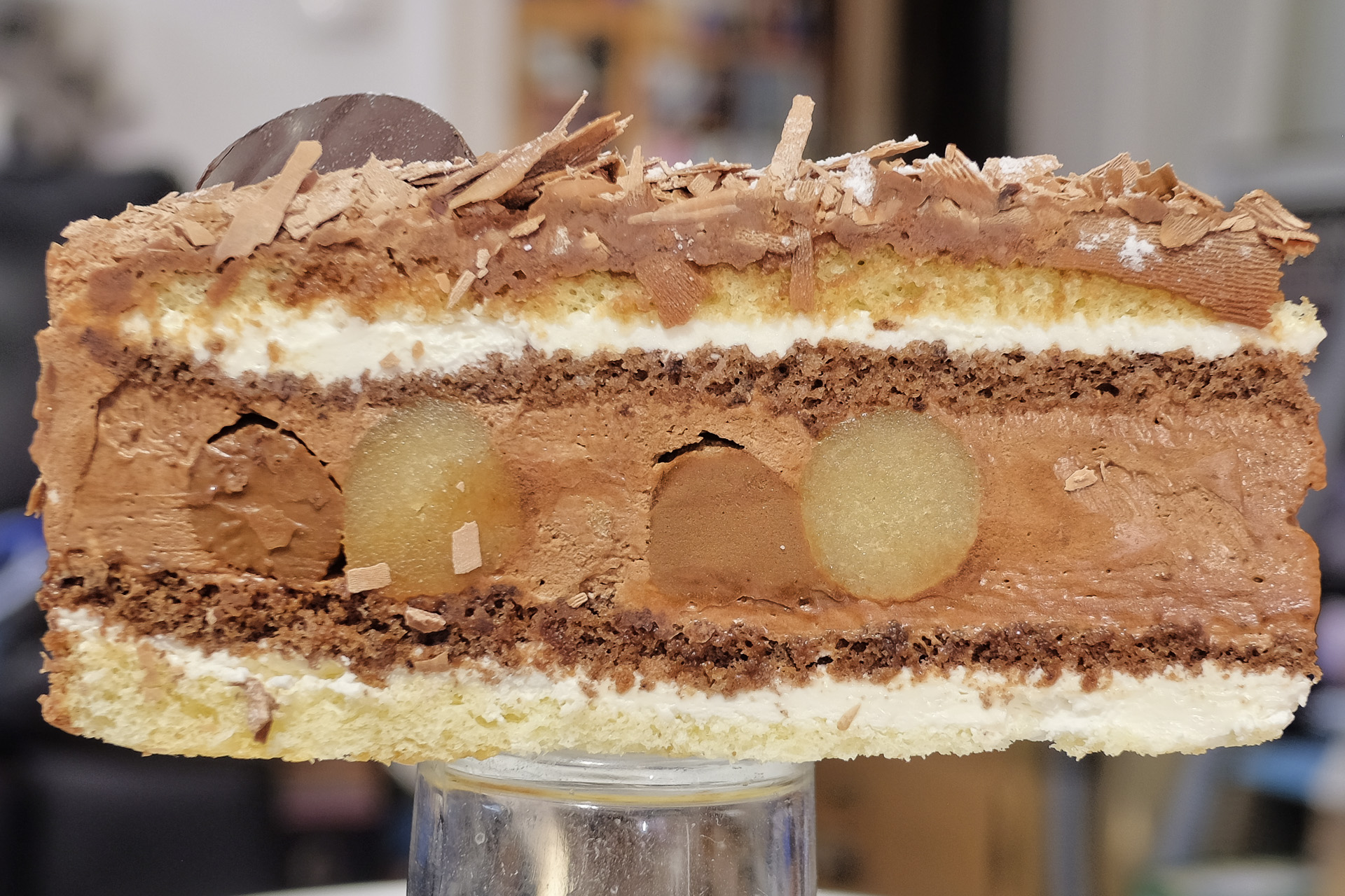 Die Schokoladen Torte wurde aus vielen Schichten aufgebaut, von unten nach oben. Eine dünne Schicht heller Biskuit, eine dünne Schicht helle Buttercreme, eine dünne Schicht Schokoladen Biskuit, eine dicke Schicht Schokoladen / Nougat Buttercreme, eine dünne Schicht Schokoladen Biskuit, eine dünne Schicht helle Buttercreme, dünne Schicht heller Biskuit und oben eine dünne Schicht Schokoladencreme. In der mittleren dicken Schicht waren ringförmig "Würste" aus Nougat und Marzipan eingearbeitet. Sehr lecker.
