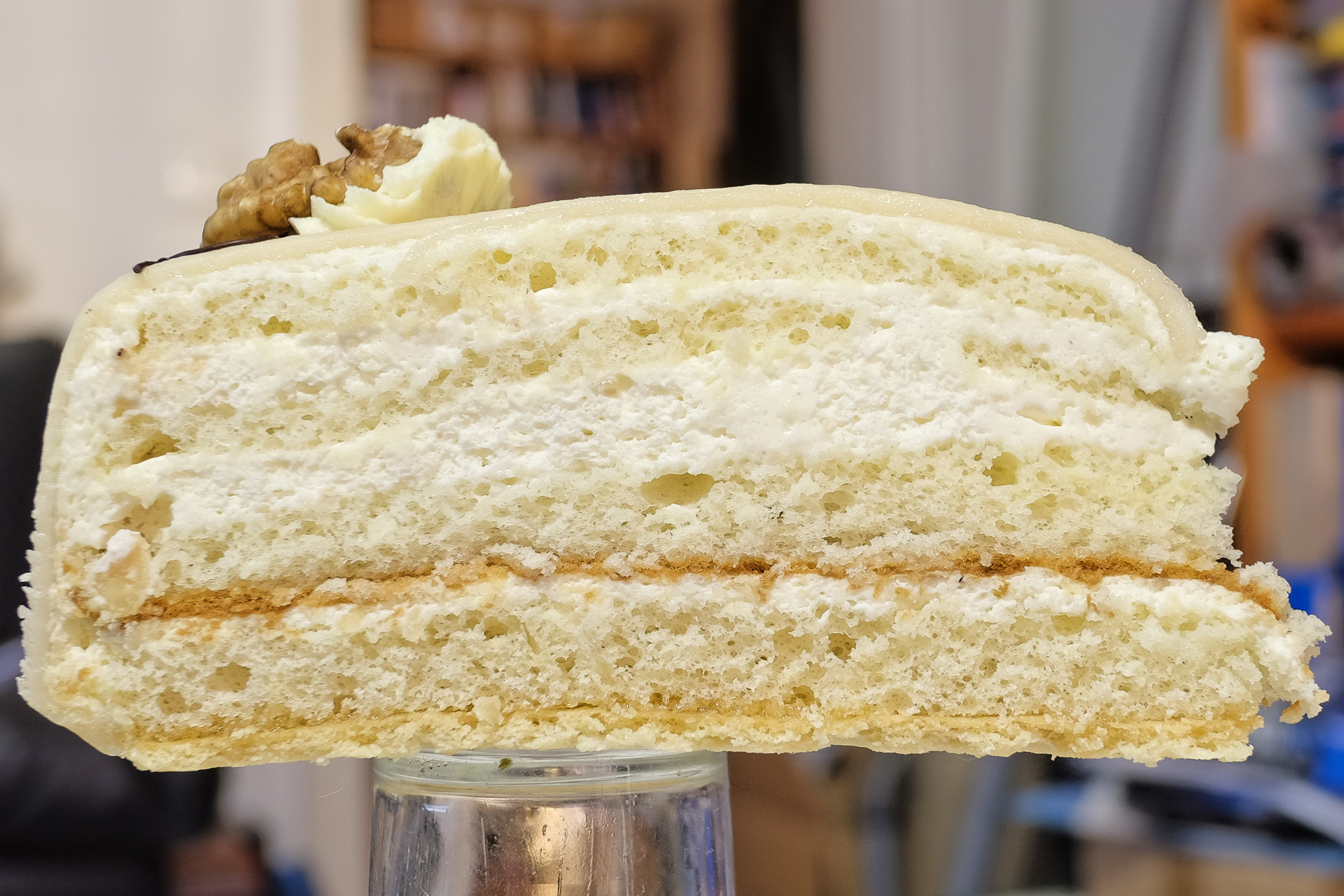 Den Boden bildete eine dünne Schicht Mürbeteig, darüber waren abwechselnd 4 Schichten Biskuit und 4 Schichten Nuss Sahne angerichtet. Bedeckt war die Torte mit einer Schicht Marzipan. Schönes klassisches Handwerk, das kann man kaum besser machen. Sehr lecker, Klasse.