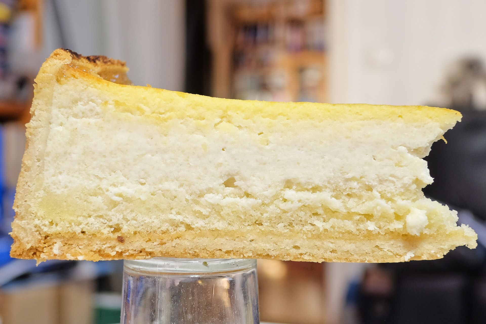 Den Boden bildete eine Schicht Mürbeteig, darüber eine Schicht Biskuit. Der Käsekuchen war recht süß und hatte eine etwas feste stumpfe Textur, er war mit etwas Zitrone aromatisiert. Gerade noch sehr lecker.