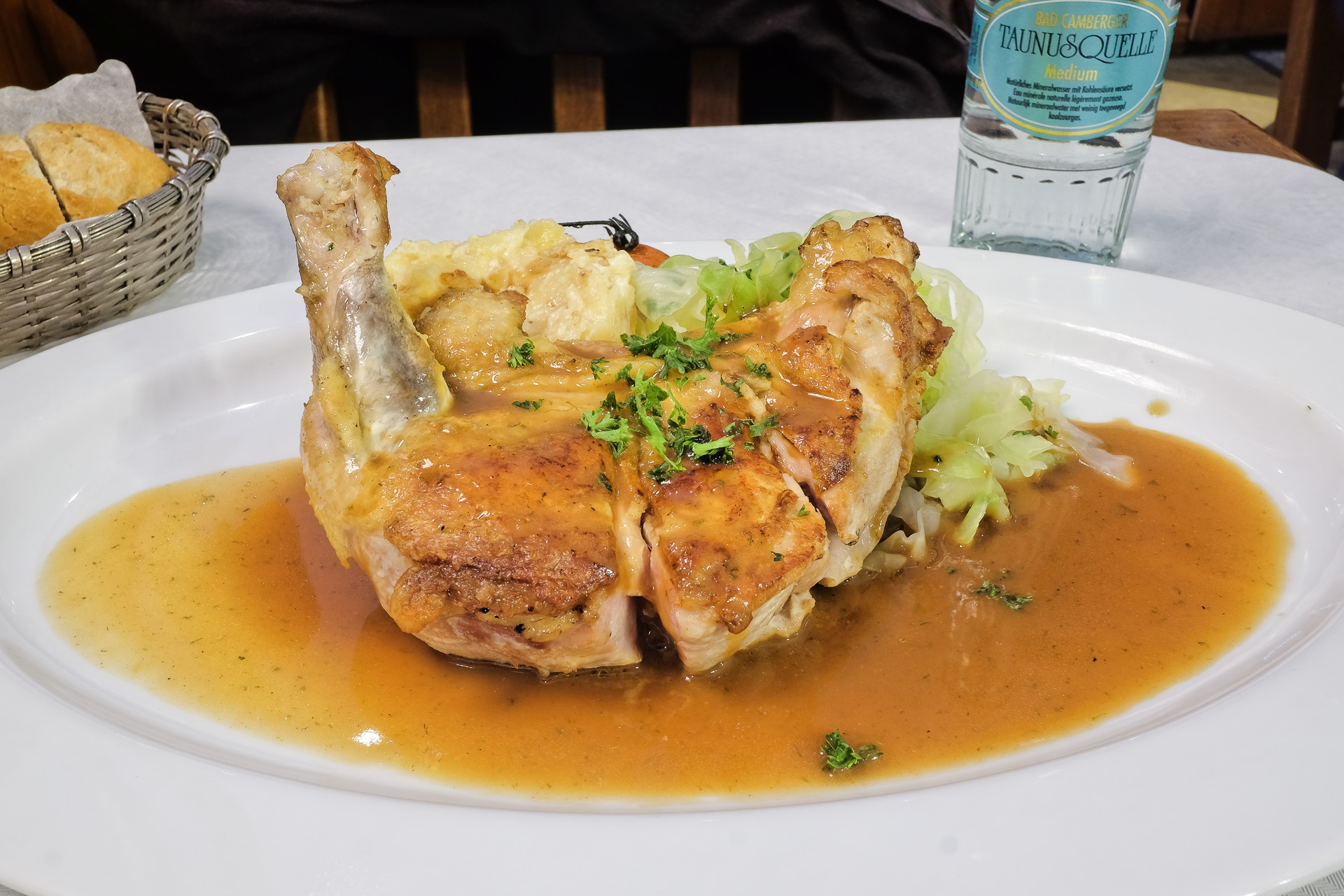 Die Perlhuhnbrust war sehr zart, saftig und hatte ein feines Aroma, nur die dünneren Ränder waren etwas zäh. Dazu gab es ein Kartoffel Gratin, Spitzkohl und eine Madeira Sauce. Die Kartoffeln waren etwas zu weich, der Spitzkohl leicht al dente. Sehr lecker.