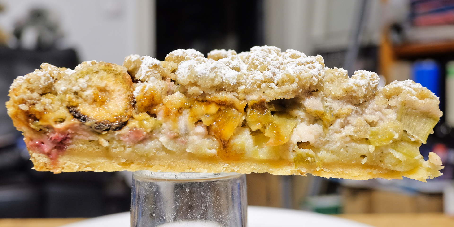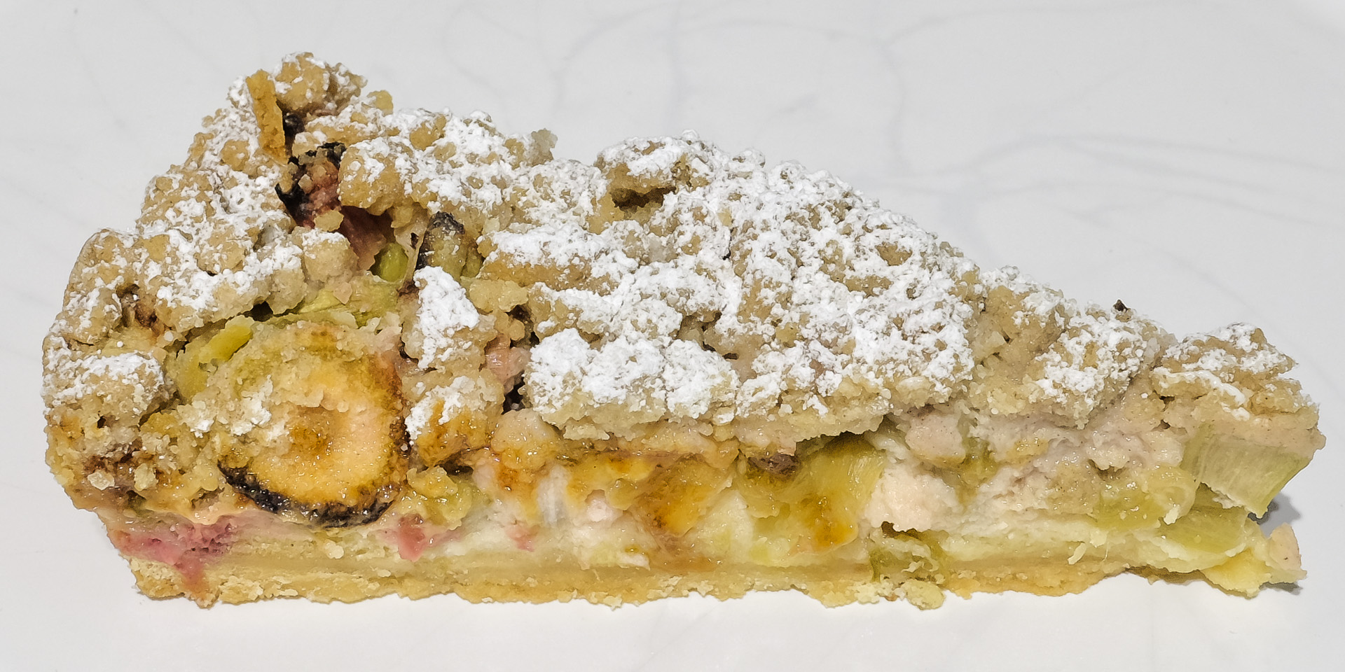 Auf einem schön buttrigen Mürbeteig Boden waren Rhabarber und Streuseln angerichtet. Sehr lecker.