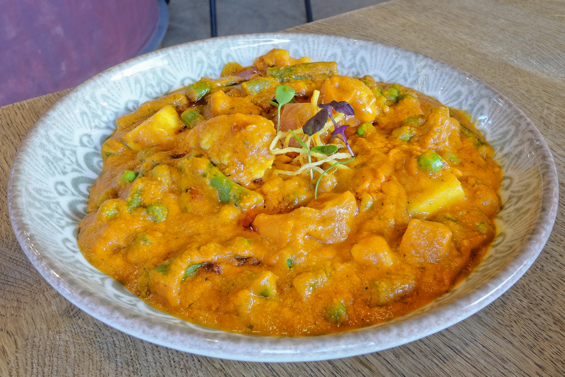 Das Karahi Curry enthielt Tomaten, Blumenkohl, Karotten, Bohnen, Erbsen, Paprika und Zwiebeln. Das Gemüse war angenehm al dente, das Curry war aromatisch und leicht pikant. Sehr lecker.