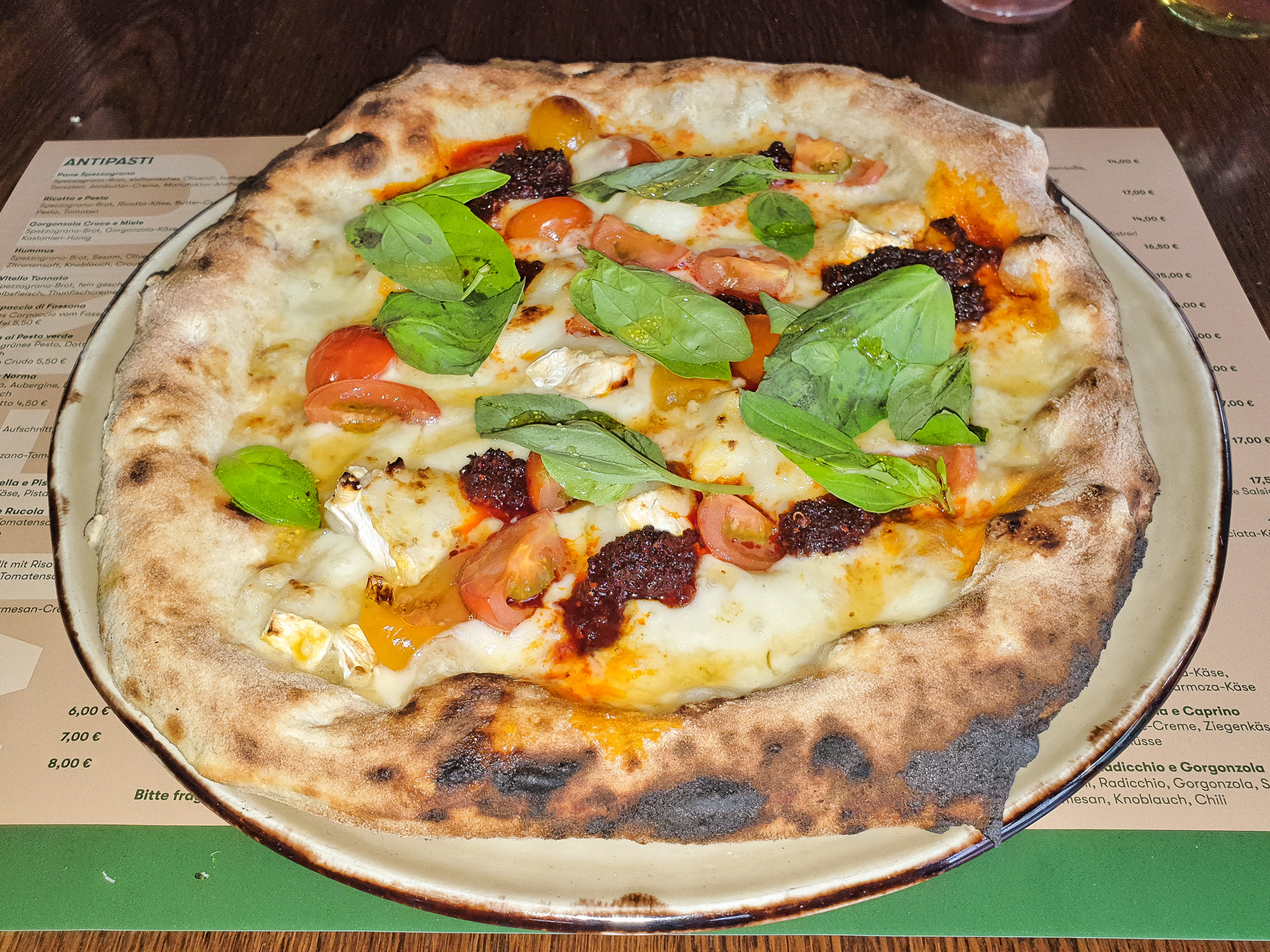 Die Pizza ist klassisch neapolitanisch, d.h. der Teig war dünn und locker und warf am Rand Blasen. Belegt war die Pizza mit gelben Datteltomaten, Fior di Latte, Ziegenkäse, Nduja, Honig und Basilikum. Der Ziegenkäse hatte ein feines Aroma, die Nduja war aromatisch und ordentlich pikant, der Honig gab der Pizza eine süße Note. Der Teig war aromatisch und hatte die typischen schwarzen Flecken ("Leoparding"), auch der Rand war nicht zäh. Die Pizza war saftig und hatte ein feines Aroma, sehr lecker.