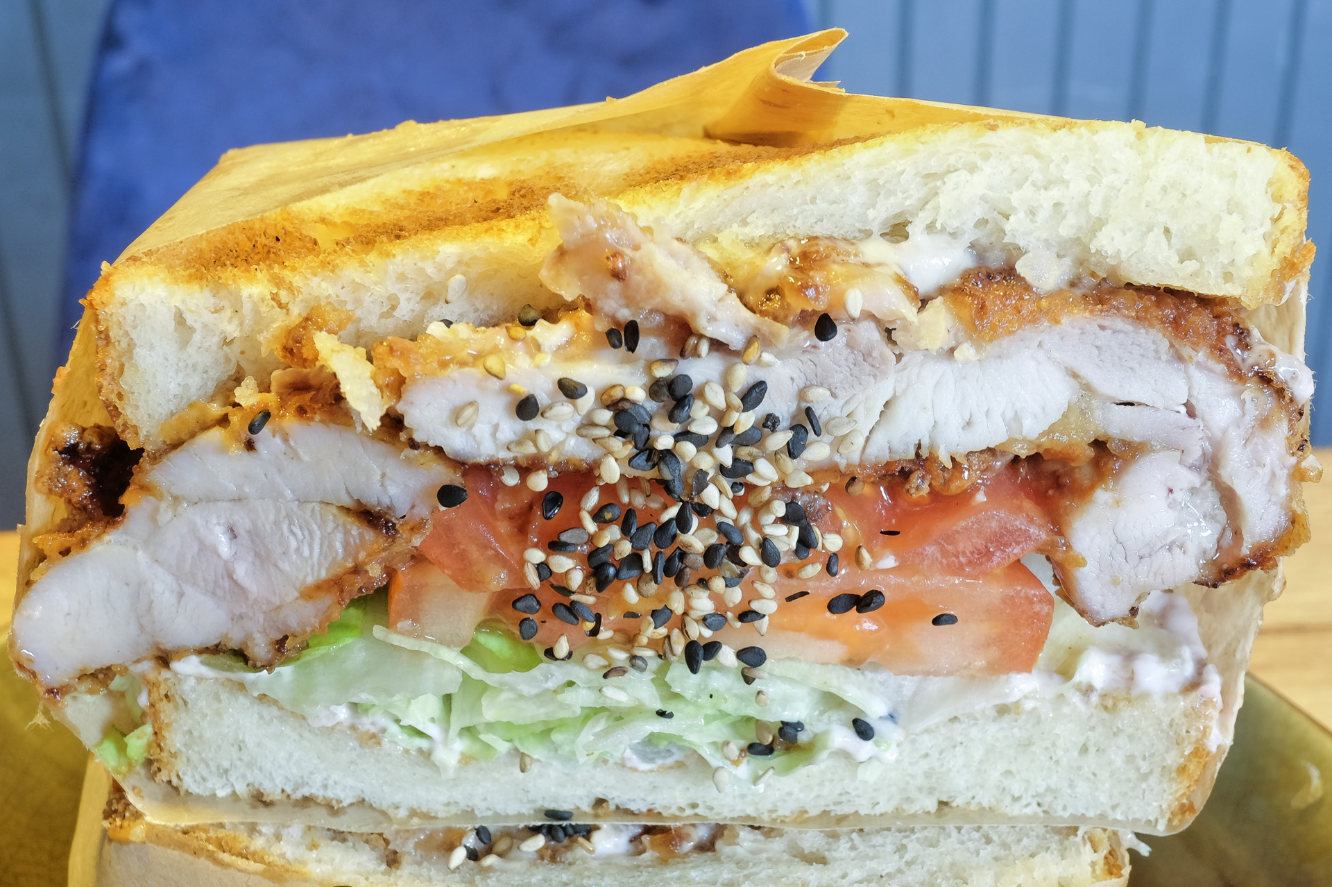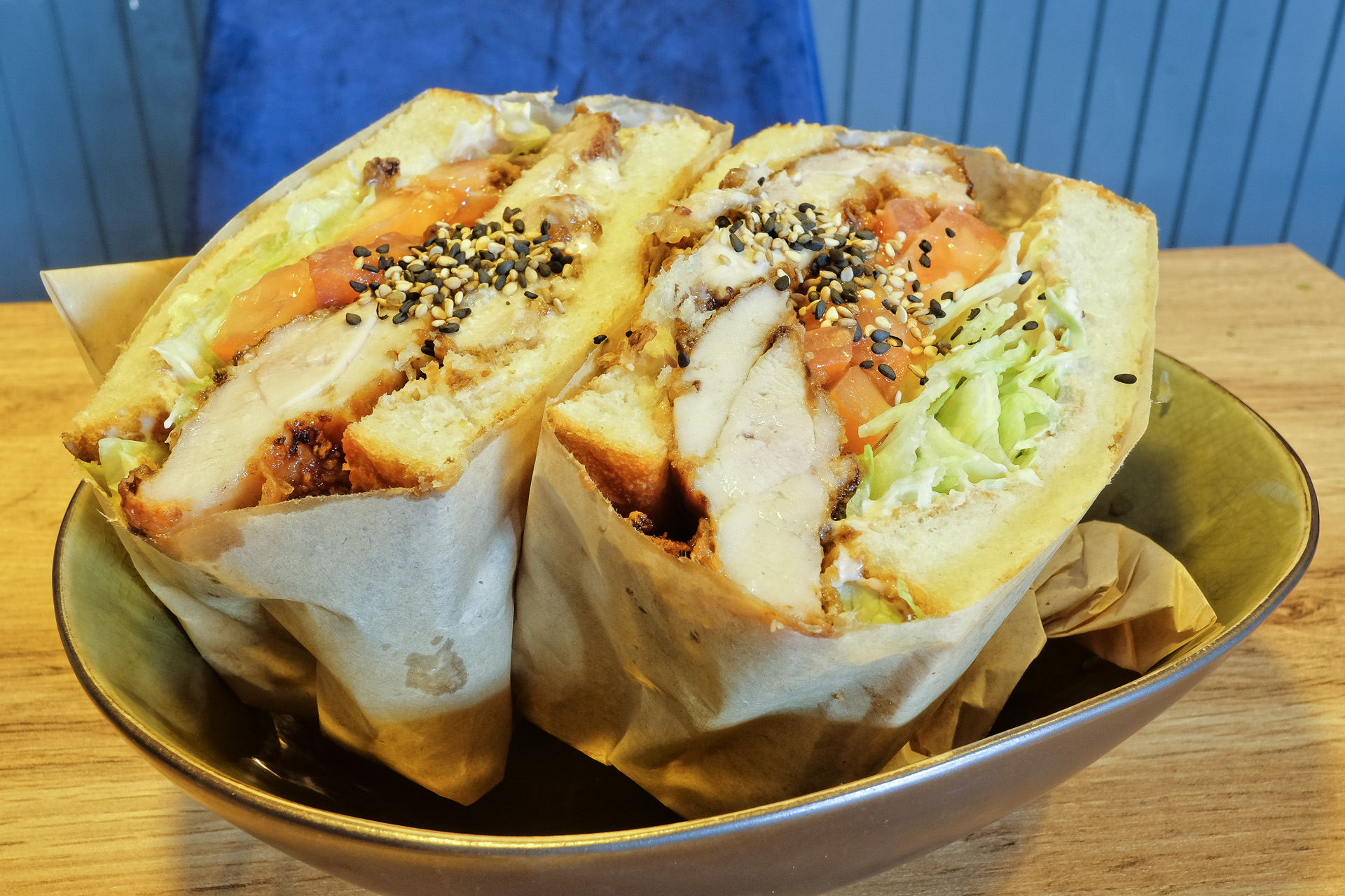 Das Shokupan Toastbrot war schön locker ohne pappig zu sein, das frittierte Hühnchen war sehr zart und saftig. Dazu gab es Eisbergsalat, Tomaten, eine Caesar Parmesan Sauce und etwas Schnittlauch und Sesam. Sehr lecker, nur die Tomaten hätten besser sein können.