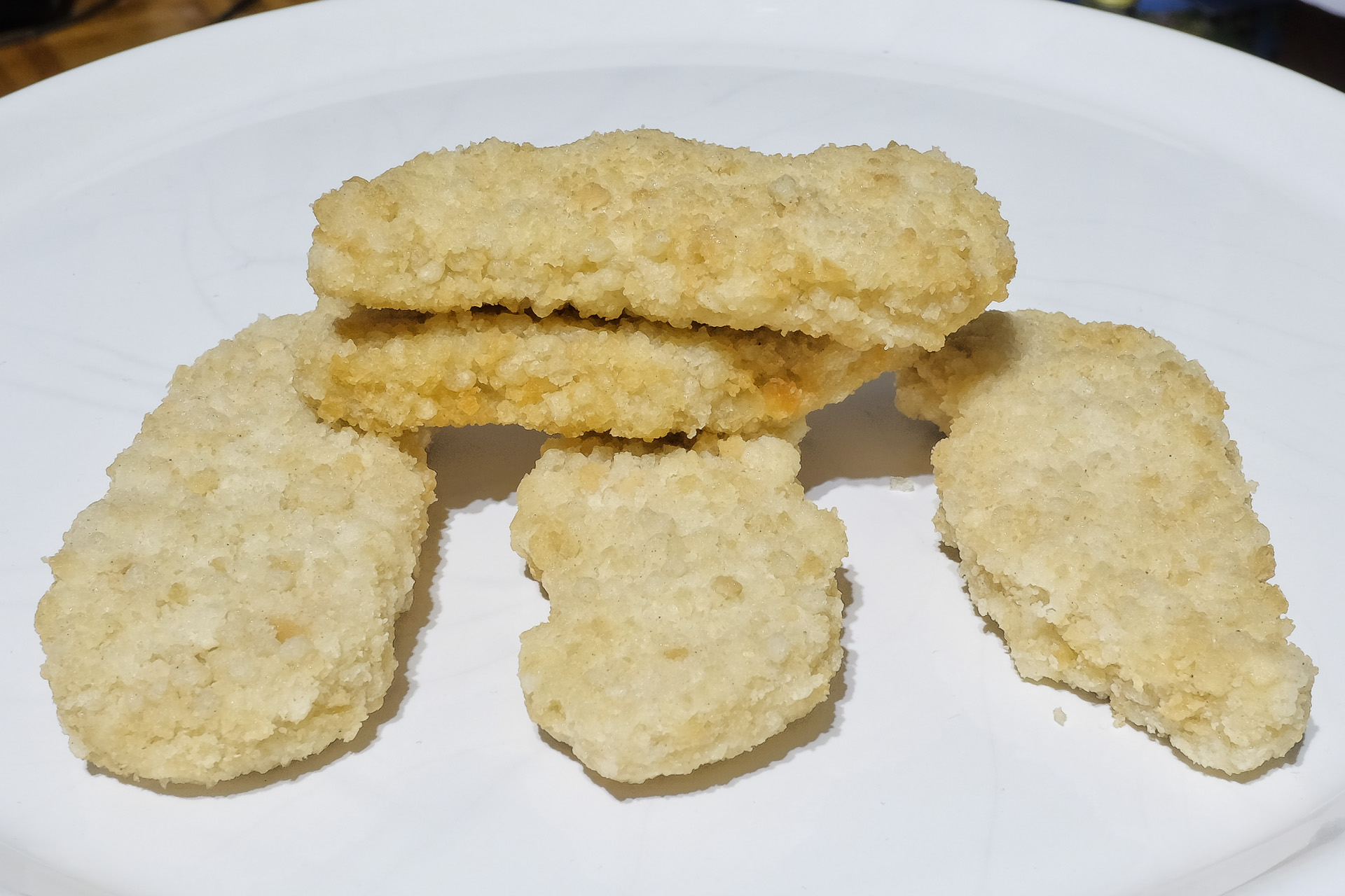 Die "Chicken-Nuggets" hatten eine krosse Panade, innen waren sie sehr zart aber auch etwas mehlig. Geschmacklich waren sie recht neutral, sie erinnerten nicht an richtige Chicken-Nuggets. Für ein Fleischersatzprodukt noch sehr lecker.