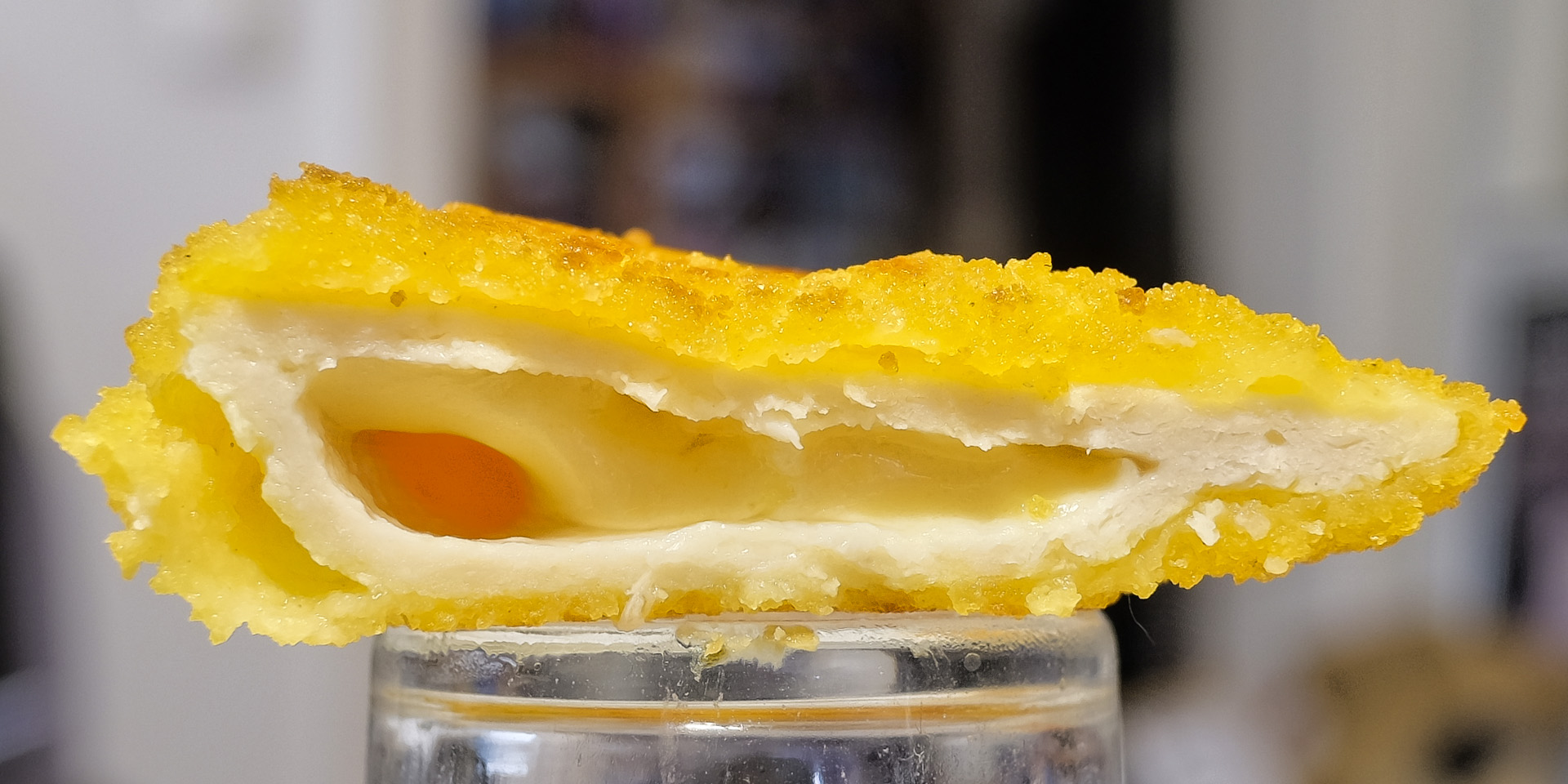 Das "Schnitzel" hatte eine krosse Panade, die Gouda Füllung war dank Schmelzsalzen geschmolzen. Das "Schnitzel" war recht dünn und hatte eine angenehme Textur. Geschmacklich war es recht neutral und erinnerte nicht an ein richtiges Schnitzel. Für ein Fleischersatzprodukt noch sehr lecker.