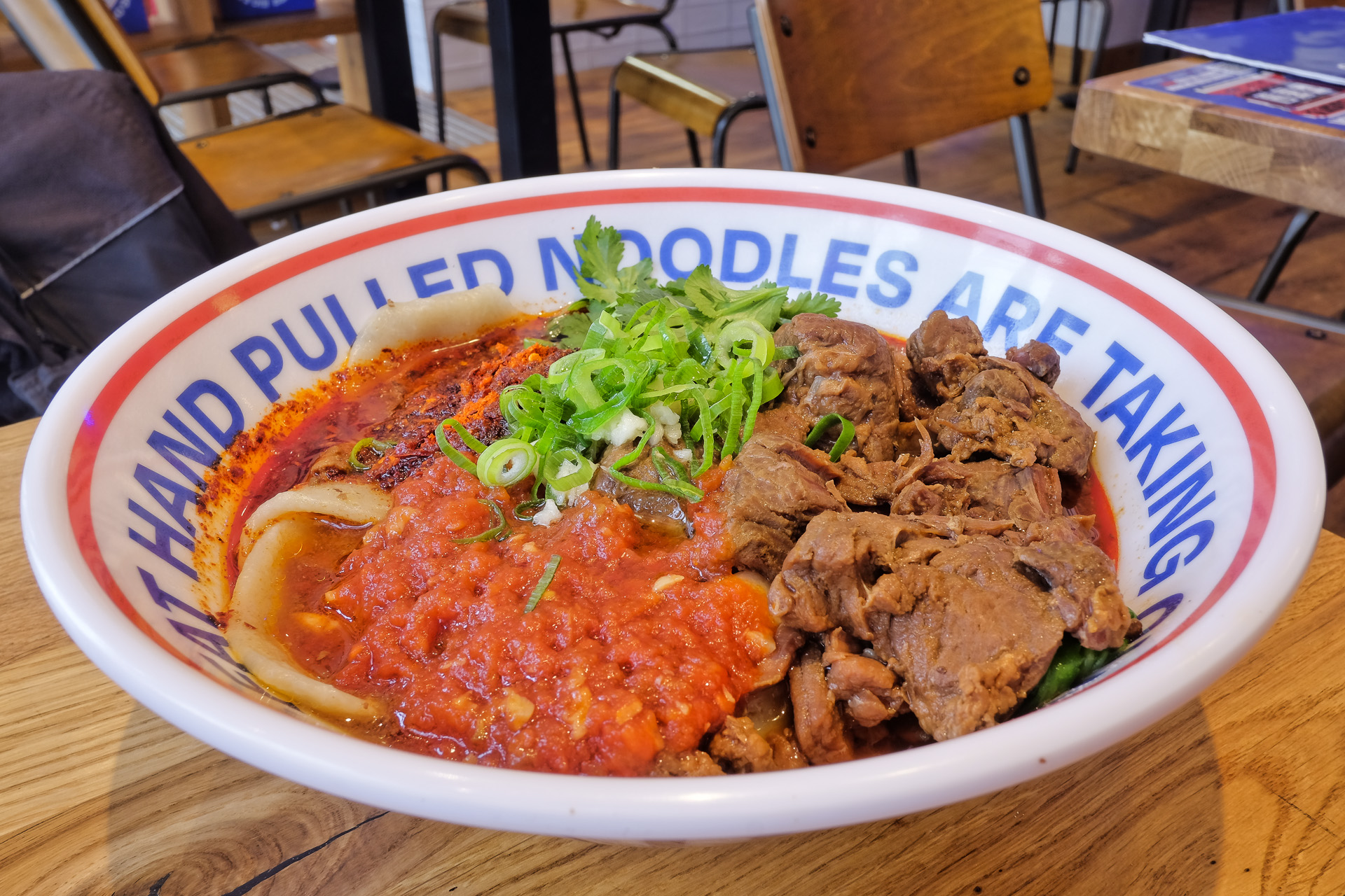 Das geschmorte Rindfleisch war zart, mürbe aber auch etwas mehlig, die Biang Biang Nudeln waren dick, weich und leicht zäh. Dazu gab es etwas Pak Choi, Chilis, Knoblauch, Koriander, Lauchzwiebeln, eine Knoblauch Tomaten Sauce und ein Zwiebel Öl. Als Schärfe hatte ich "Extra Spicy" gewählt, das war für mich genau richtig. Sehr lecker, das Cyn Cyn fand ich aber besser.