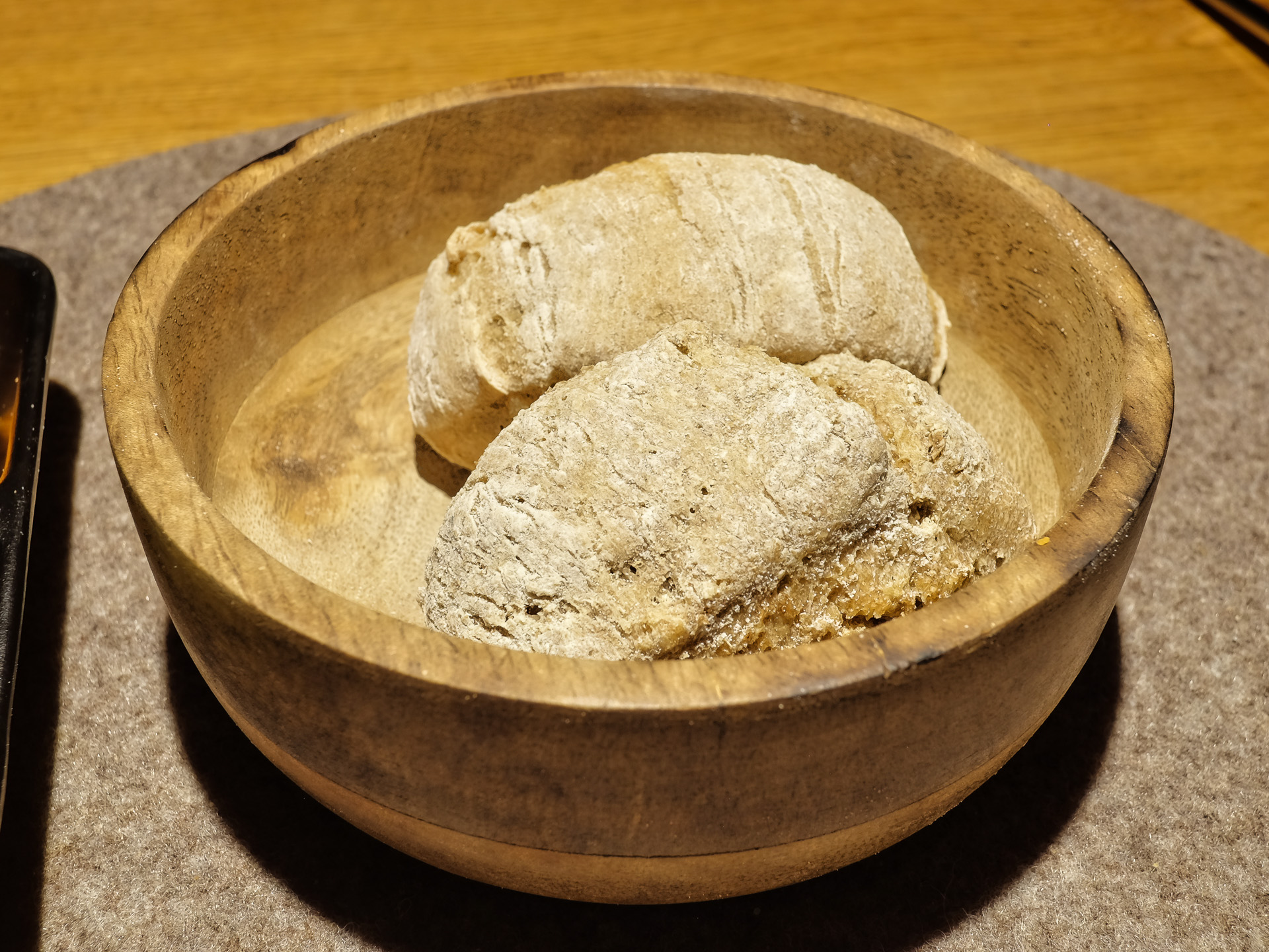 Vor dem Essen wurde etwas warmes Brot gereicht, es hatte eine etwas festere Krume. Sehr lecker.