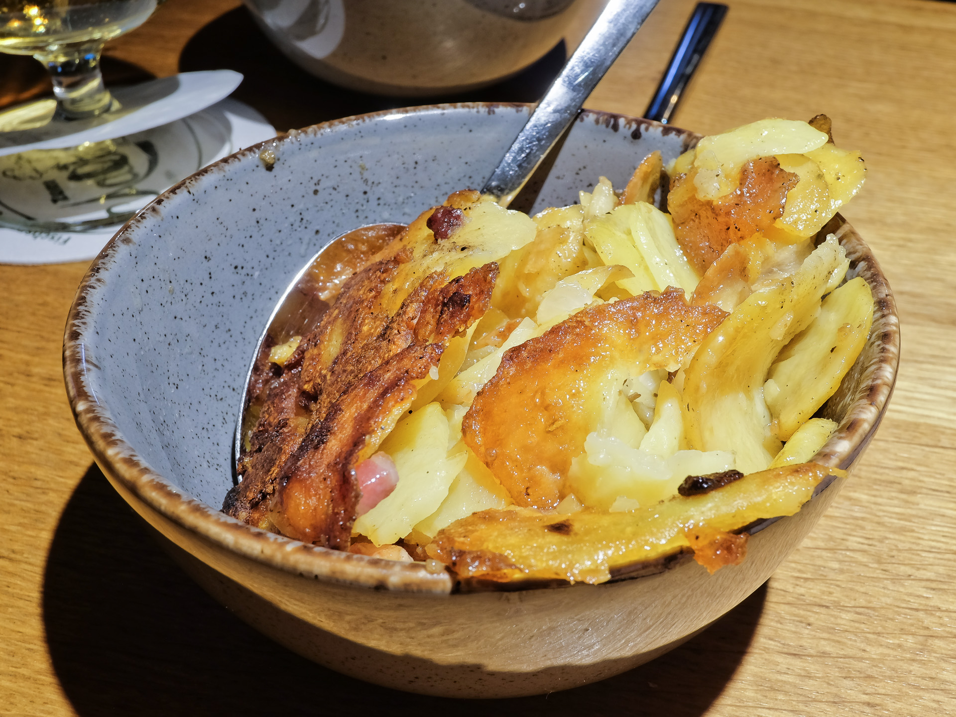 Als Beilage gab es Bratkartoffeln die mit etwas Speck und Zwiebeln zubereitet waren. Sehr lecker.