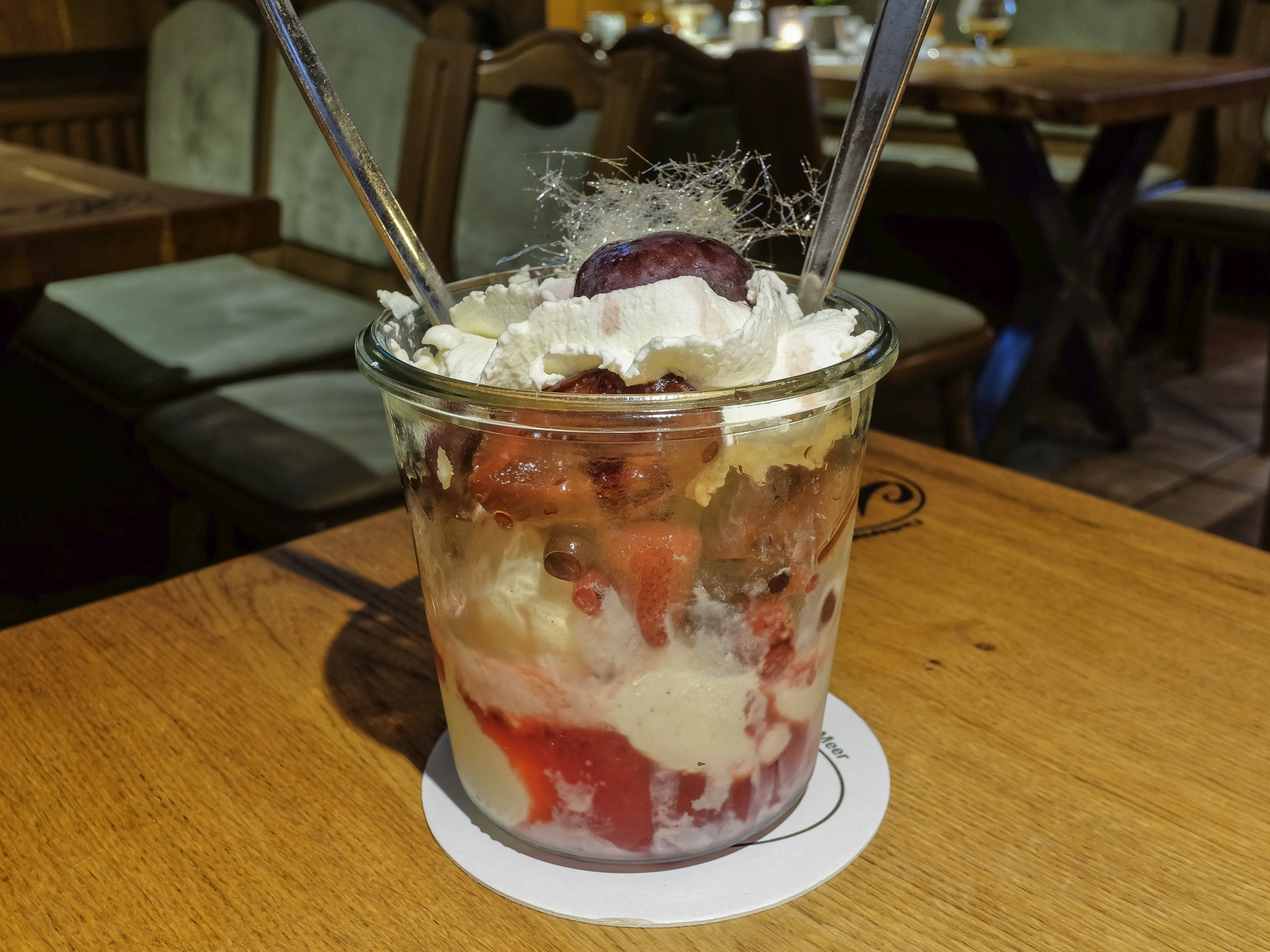 Das Eis war cremig und hatte ein feines Aroma, der Rumtopf hätte etwas aromatischer sein können, das Obst war teilweise auch etwas fest. Dazu gab es noch etwas Schlagsahne. Für eine Person eine recht große Portion, wir hatten sie uns geteilt. Gerade noch sehr lecker.