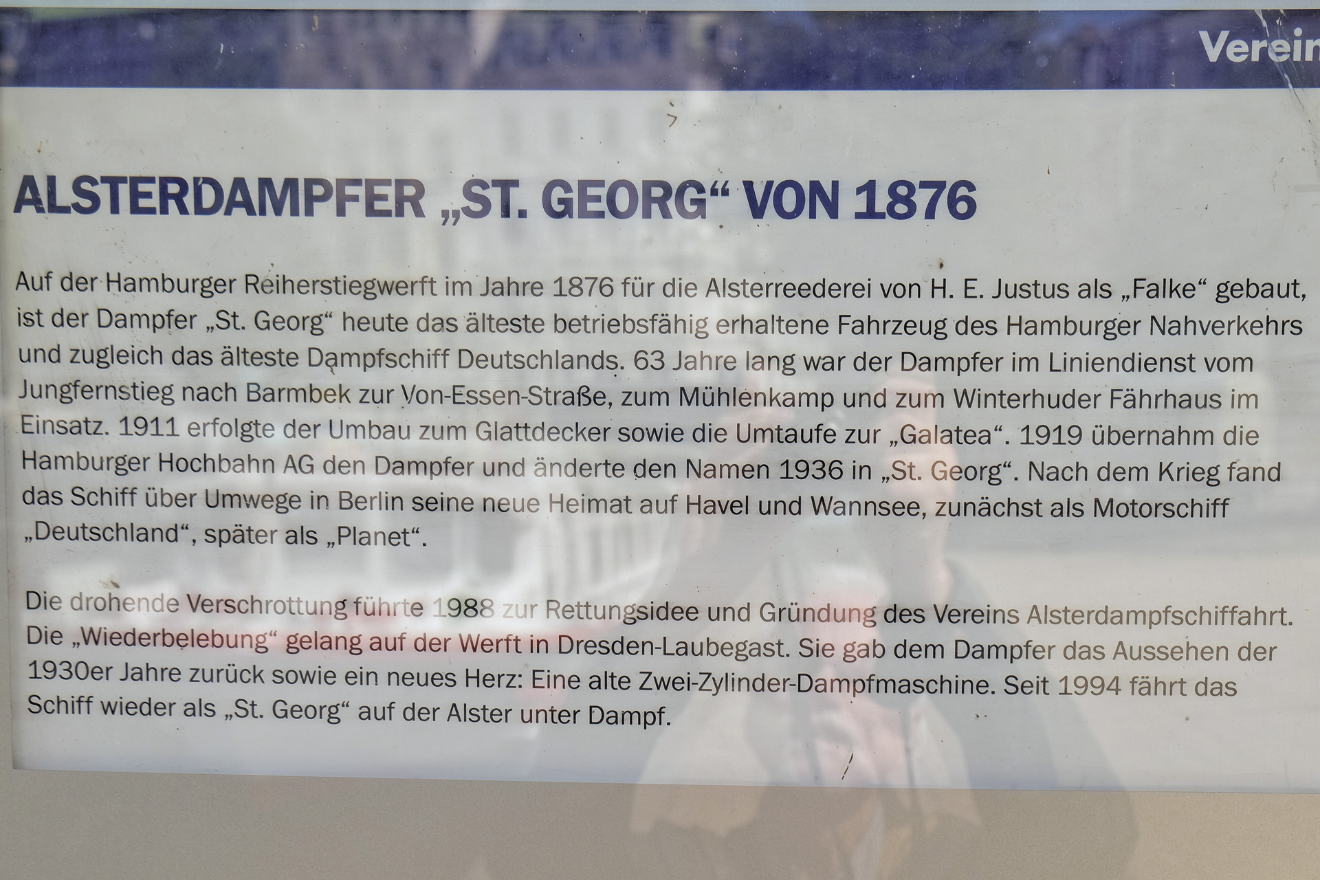 Die St. Georg wurde 1876 auf der Reiherstiegwerft gebaut, betrieben wird sie vom Alsterdampfschiffahrt e.V..