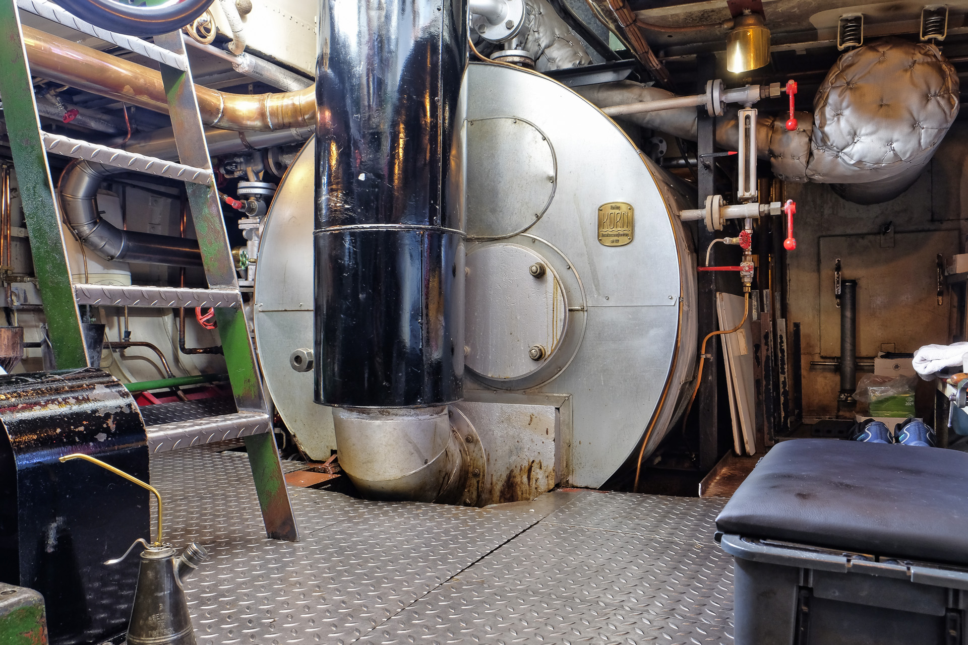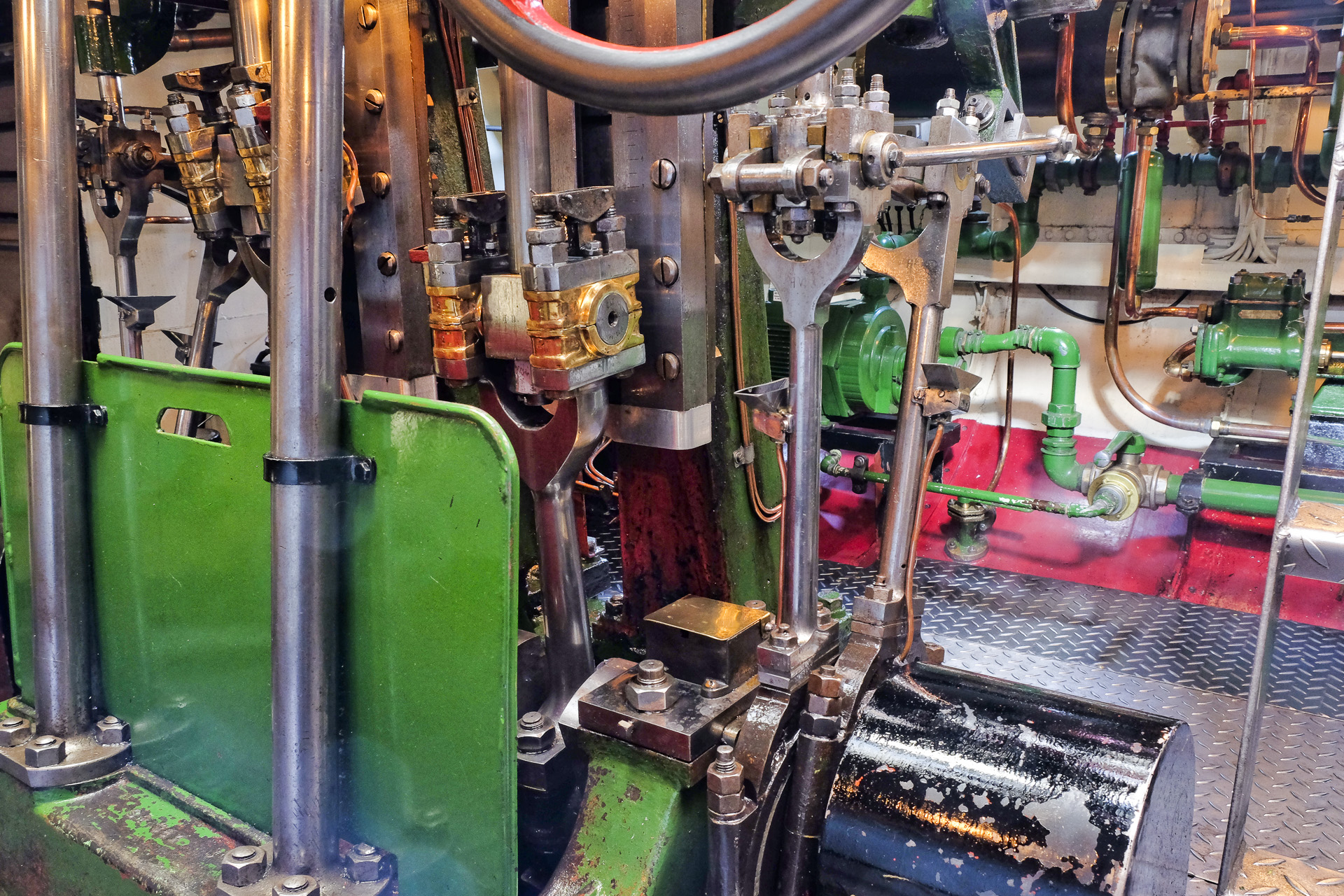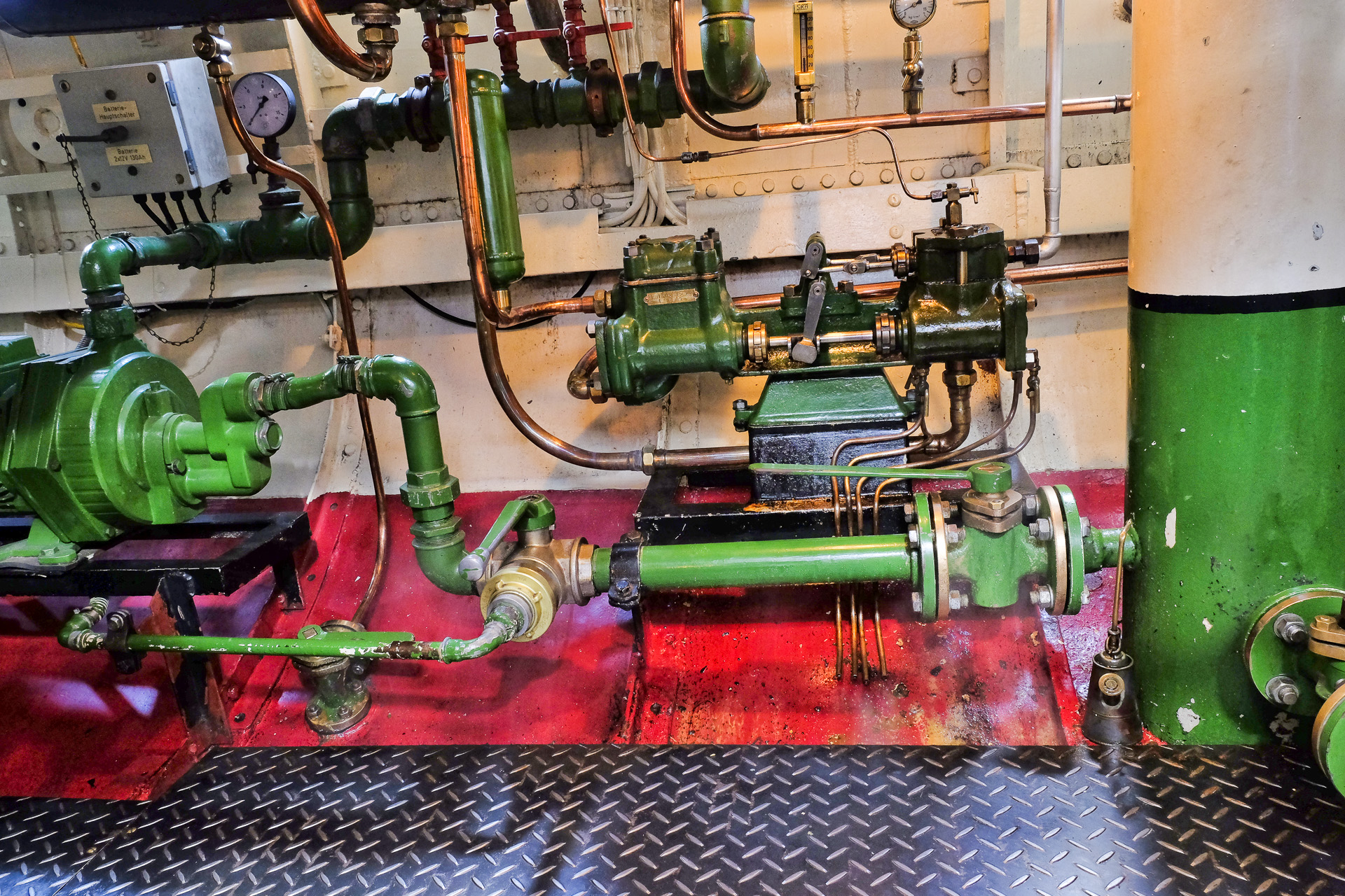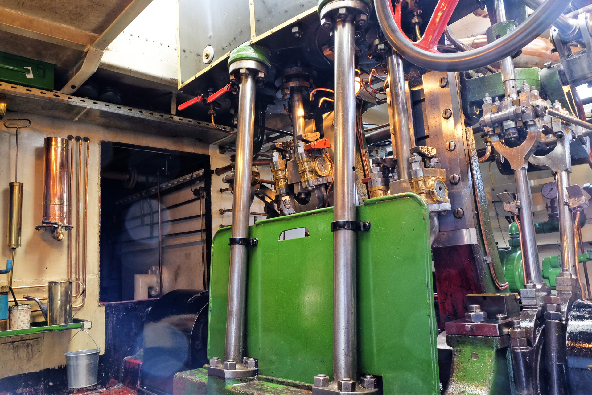 Durch offene Luken kann man einen Blick auf die Maschinenanlage werfen. Die 2 Zylinder Dampfmaschine stammt aus dem Jahr 1922 und leistet 75 PS.