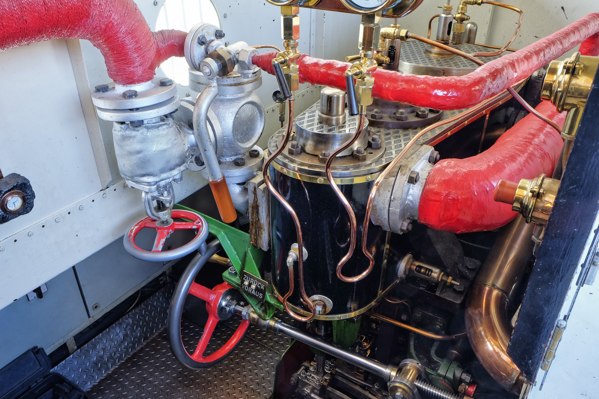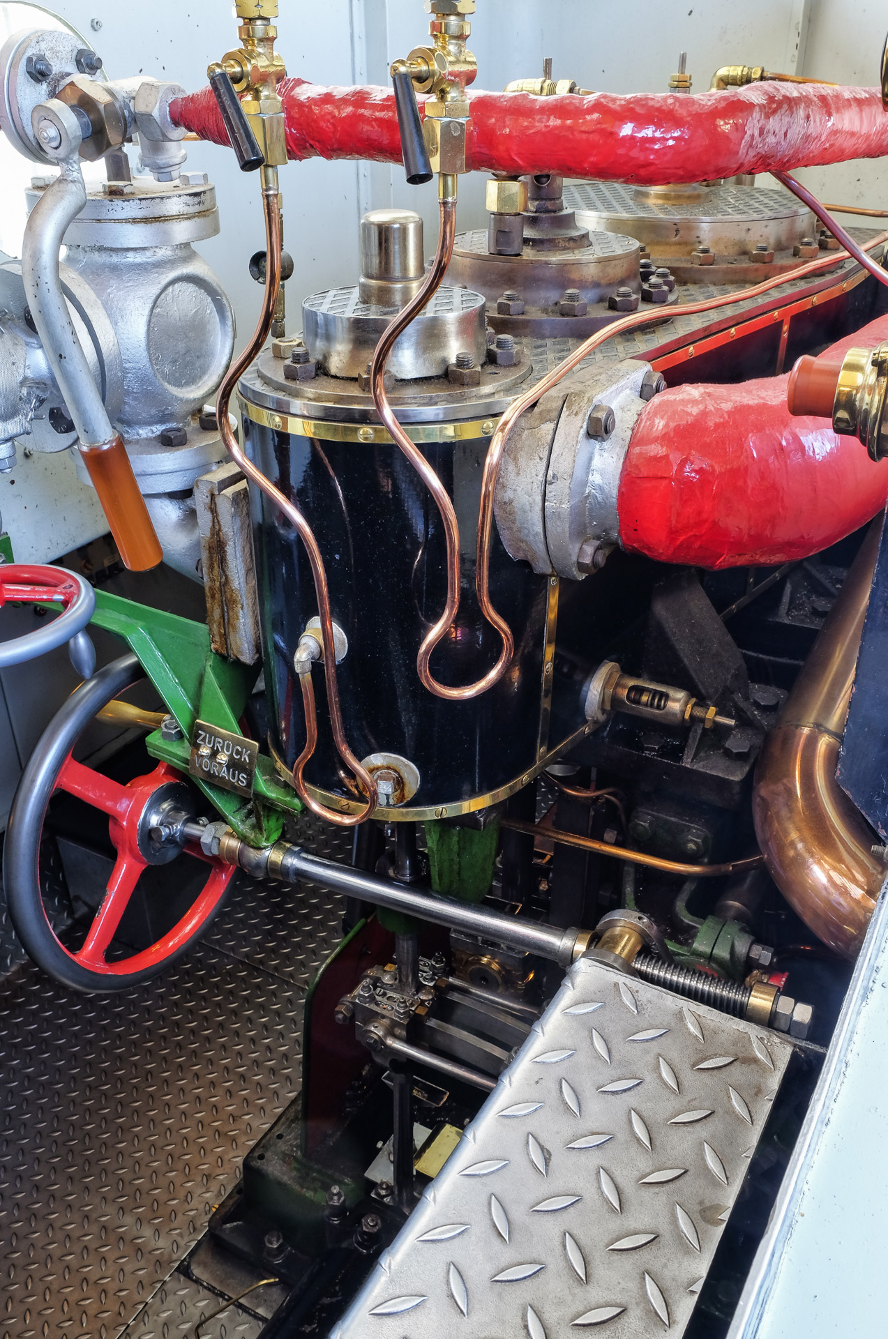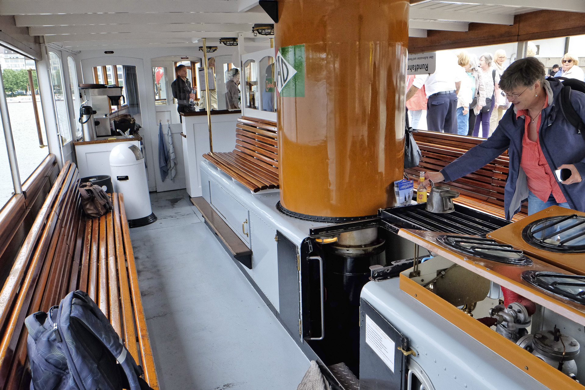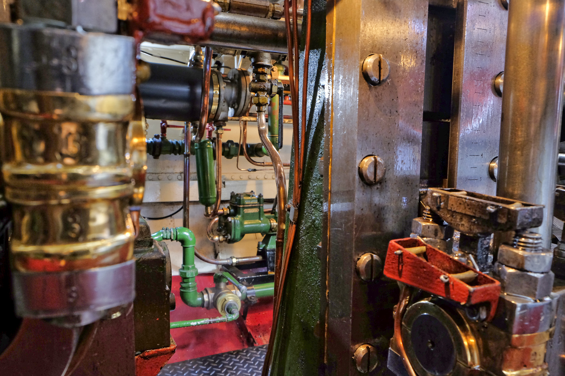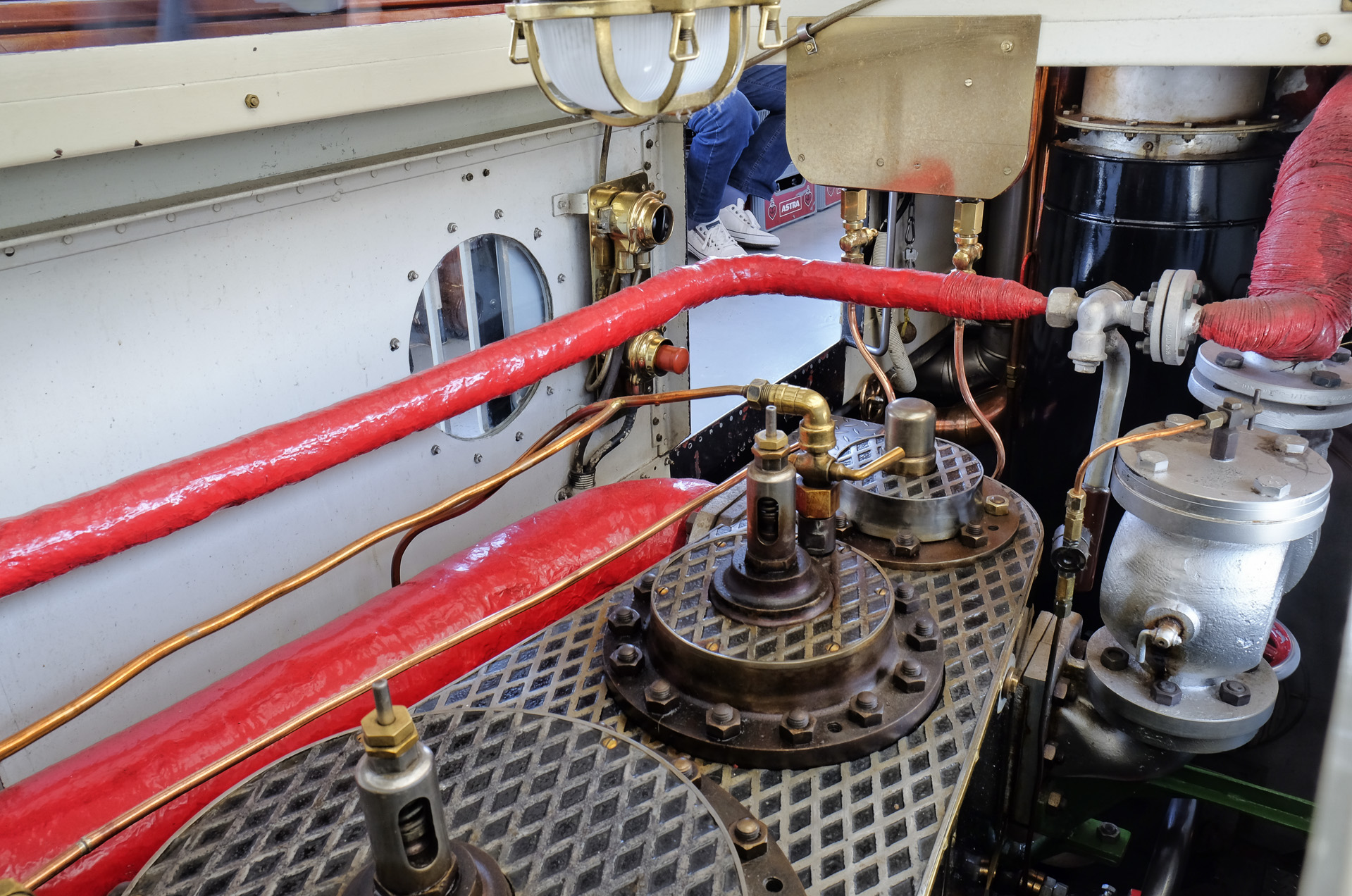 Durch offene Luken kann man einen Blick auf die Maschinenanlage werfen. Die 2 Zylinder Dampfmaschine stammt aus dem Jahr 1922 und leistet 75 PS.