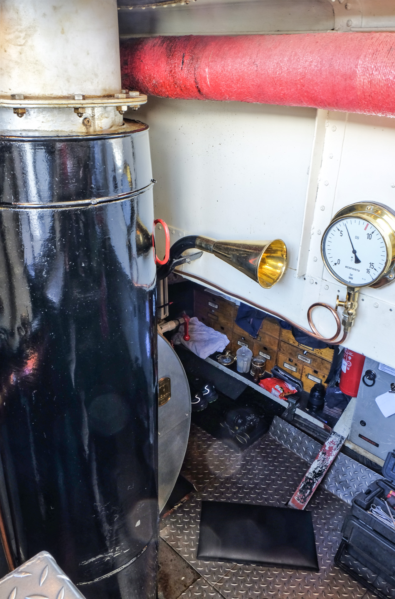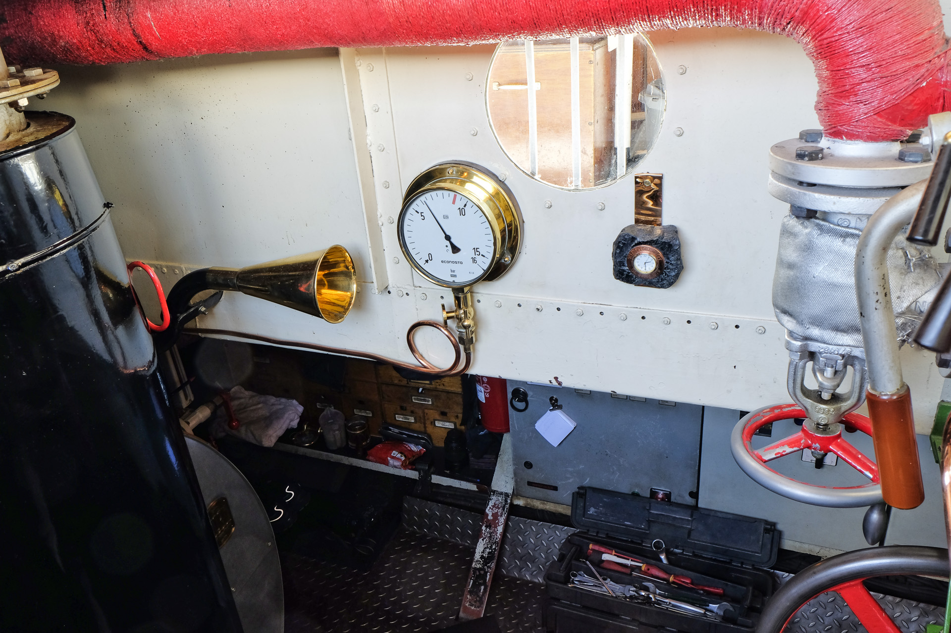 Eine steile Treppe führt in den Maschinenraum. Als Besucher kann man ihn besichtigen, während der Fahrt mit dem Maschinisten.