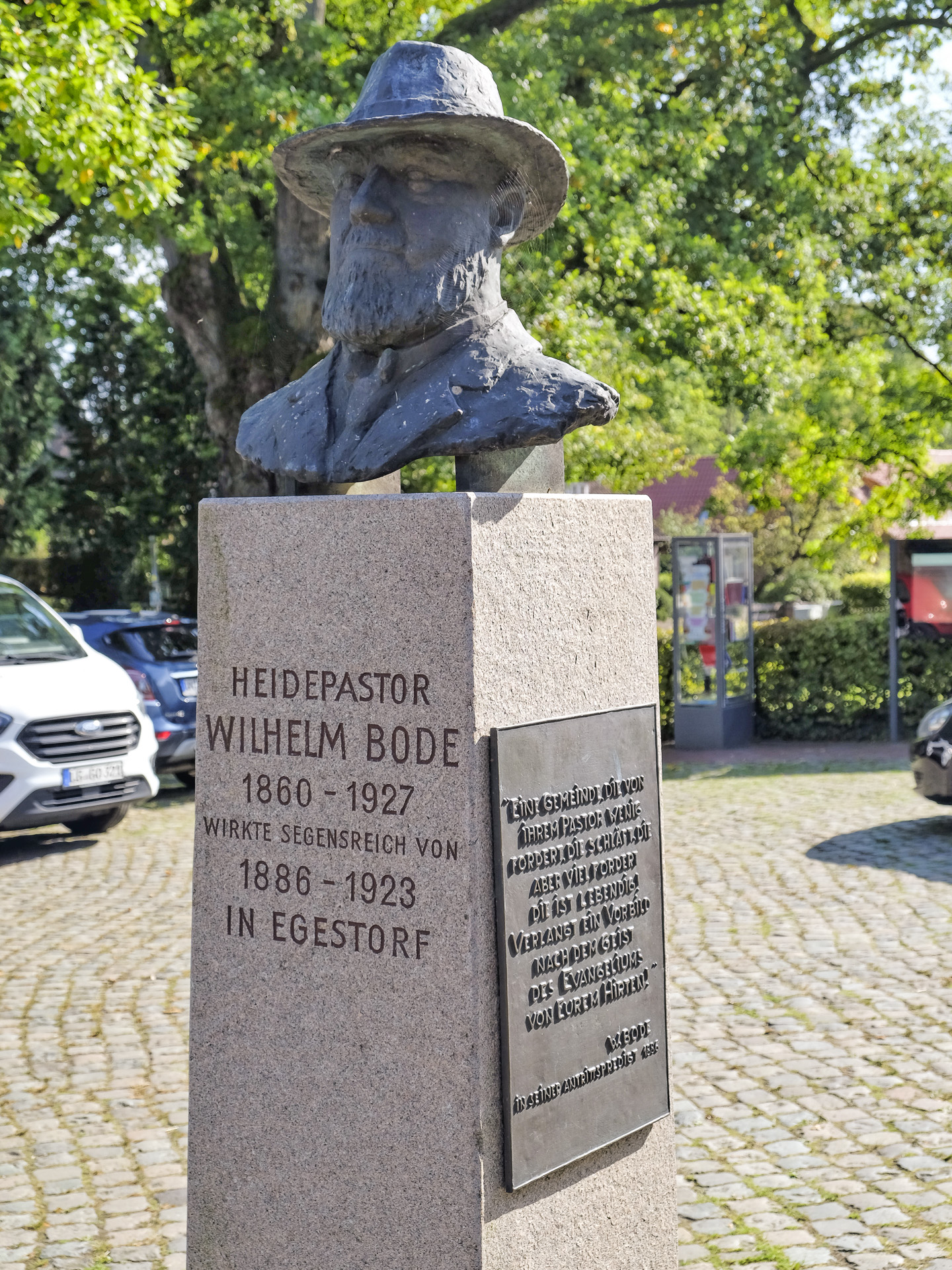 Neben der St. Stephanus Kirche steht das Denkmal für den Heidepastor Wilhelm Bode.