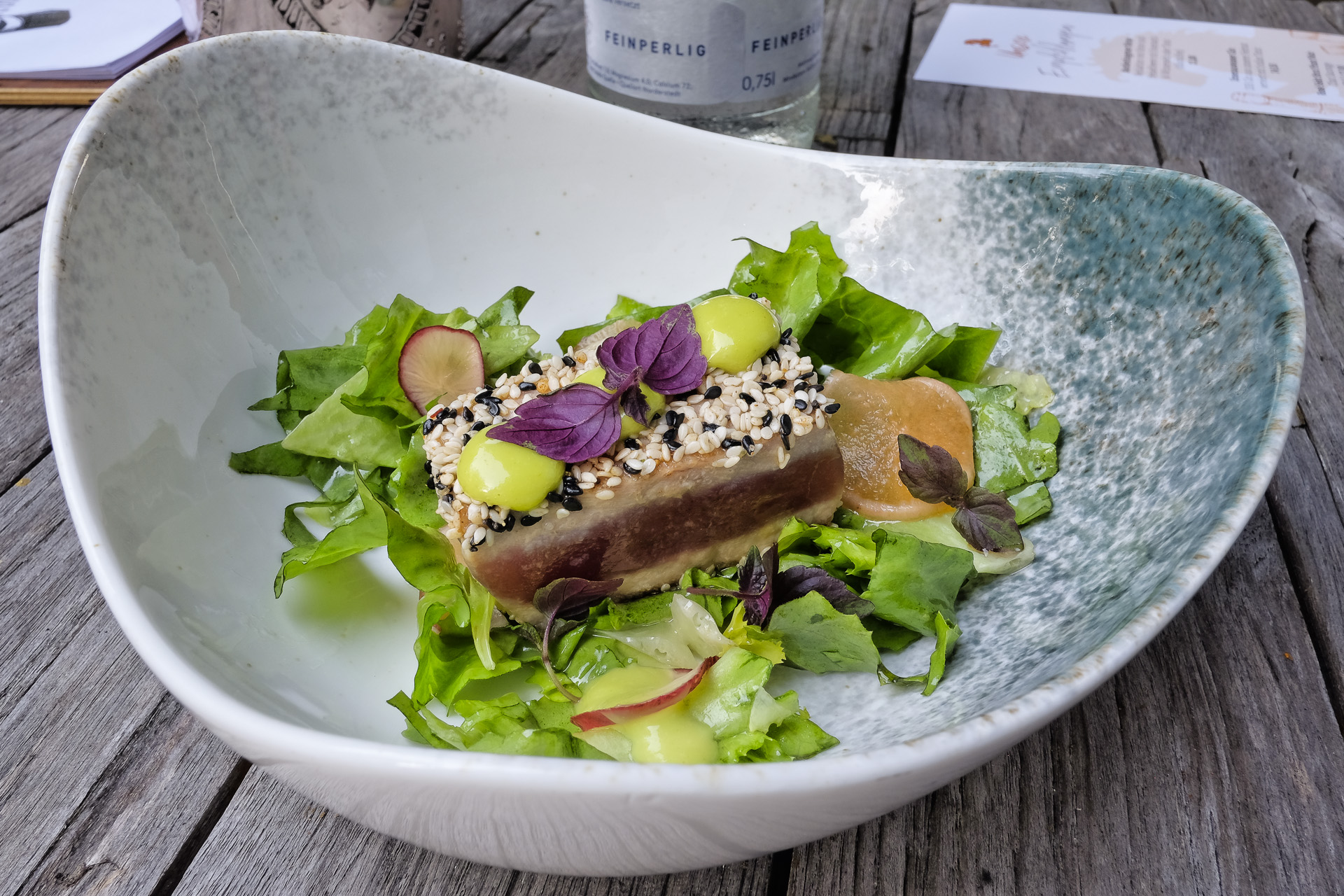 Der Thunfisch war leicht angebraten, er war zart ohne mehlig zu sein und hatte ein feines Aroma. Dazu gab es Endivie, Radieschen, Sesam und Mirin. Sehr lecker.