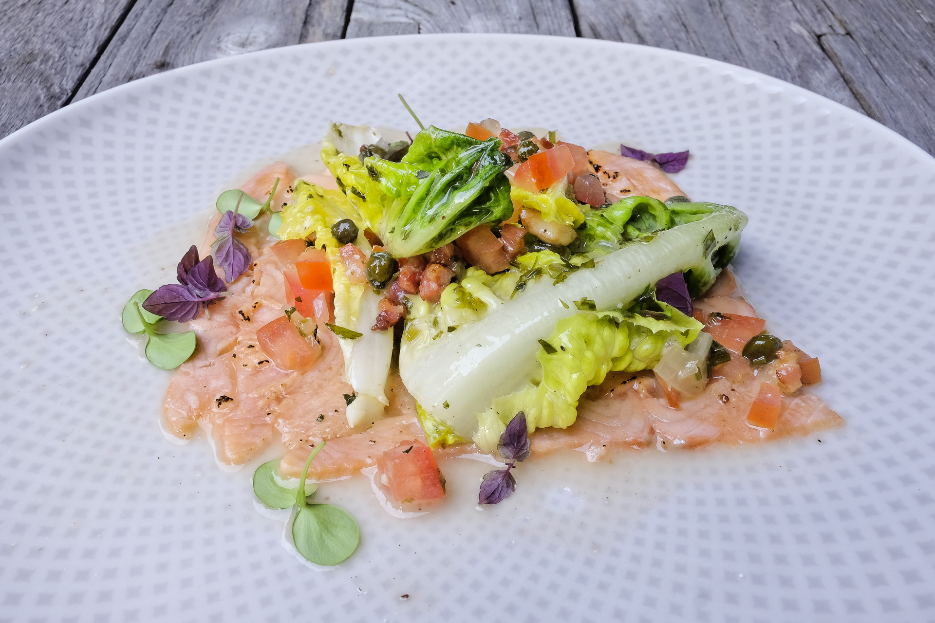 Gebeiztes Lachsfilet | Kapern-Speck Vinaigrette | Tomate | Salatherzen